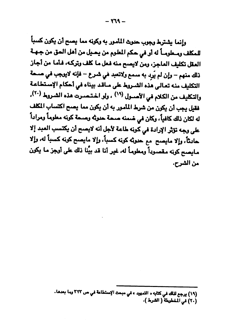 وإنما يَشترط وجوبَ حدوث المأمور به وكونه مما يصح أن يكون كسبًا للمكلف ومعلومًا له أو في حكم المعلوم مَنْ يُحيل من أهل الحق من جهة العقل تكليفَ العاجز, ومن لا يصح منه فعل ما كلف وتركه, فأما من أجاز ذلك منهم - وإن لم يرد به سمع ولا تعبد في شرع - فإنه لا يوجب في صحة التكليف منه تعالى هذه الشروط على ما قد بيناه في أحكام الاستطاعة والتكليف من الكلام في الأصول, ولو اختصرت هذه الشروط, فقيل يجب أن يكون من شرط المأمور به أن يكون مما يصح اكتساب المكلف له لكان ذلك كافيًا, وكان في ضمنه صحة حدوثه وصحة كونه معلومًا ومرادًا على وجه تؤثر الإرادة في كونه طاعة لأجل أنه لا يصح أن يكتسب العبد إلا حادثًا, وإلا ما يصح مع حدوثه كونه كسبًا, وإلا ما يصح كونه كسبًا له, وإلا ما يصح كونه مقصودًا ومعلومًا له, غير أنا قد بينا ذلك على أوجز ما يكون من الشرح.