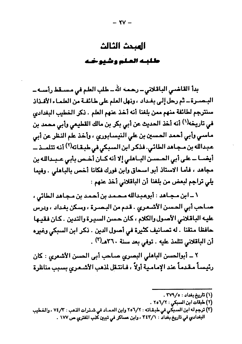 ١ - ابن مجاهد: أبو عبد الله محمد بن أحمد بن مجاهد الطائي، صاحب أبي الحسن الأشعري. قدم من البصرة، وسكن بغداد، ودرس عليه الباقلاني الأصول والكلام، كان حسن السيرة والتدين. كان فقيهًا حافظًا متقنًا. له تصانيف كثيرة في أصول الدين. ذكر ابن السبكي وغيره أن الباقلاني تتلمذ عليه. توفي بعد سنة ٣٦٠ هـ.