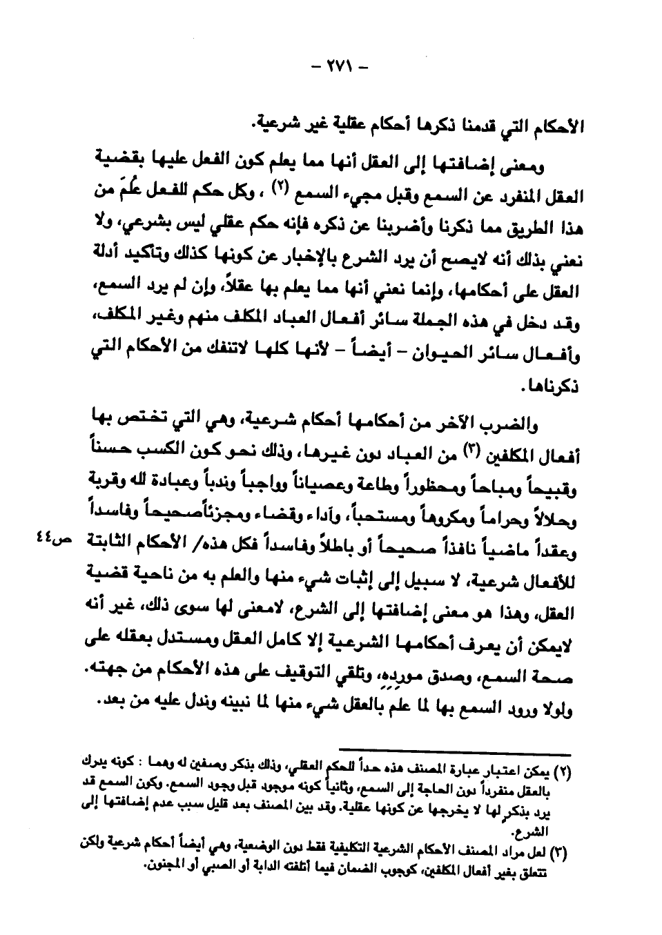 والضرب الآخر من أحكامها أحكام شرعية, وهي التي تختص بها أفعال المكلفين من العباد دون غيرها, وذلك نحو كون الكسب حسنًا وقبيحًا ومباحًا ومحظورًا وطاعة وعصيانًا وواجبًا وندبًا وعبادة لله وقربة وحلالًا وحرامًا ومكروهًا ومستحبًا, وأداء وقضاء ومجزئًا صحيحًا وفاسدًا وعقدًا ماضيًا نافذًا صحيحًا أو باطلًا وفاسدًا فكل هذه/ ص ٤٤ الأحكام الثابتة للأفعال شرعية, لا سبيل إلى إثبات شيء منها والعلم به من ناحية قضية العقل, وهذا هو معنى إضافتها إلى الشرع, لا معنى لها سوى ذلك, غير أنه لا يمكن أن يعرف أحكامها الشرعية إلا كامل العقل ومستدل بعقله على صحة السمع, وصدق مورده, وتلقي التوقيف على هذه الأحكام من جهته, ولولا ورود السمع بها لما علم بالعقل شيء منها لما نبينه وندل عليه من بعد.