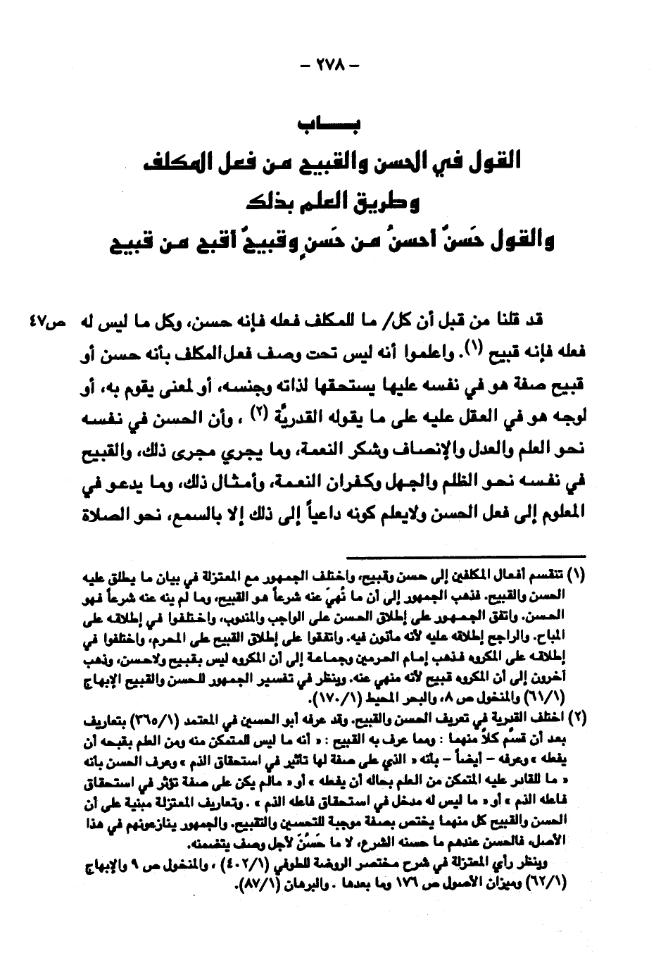 قد قلنا من قبل أن كل/ ص ٤٧ ما للمكلف فعله فإنه حسن, وكل ما ليس له فعله فإنه قبيح, واعلموا أنه ليس تحت وصف فعل المكلف بأنه حسن أو قبيح صفة هو في نفسه عليها يستحقها لذاته وجنسه, أو لمعنى يقوم به, أو لوجه هو في العقل عليه على ما يقوله القدرية, وأن الحسن في نفسه نحو العلم والعدل والإنصاف وشكر النعمة, وما يجري مجرى ذلك, والقبيح في نفسه نحو الظلم والجهل وكفران النعمة, وأمثال ذلك, وما يدعو في المعلوم إلى فعل الحسن ولا يعلم كونه داعيًا إلى ذلك إلا بالسمع, نحو الصلاة