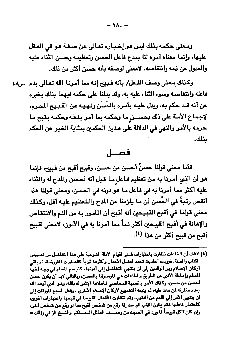 وكذلك معنى وصف الفعل/ ص ٤٨ بأنه قبيح إنه مما أمرنا الله تعالى بذم فاعله وانتقاصه وسوء الثناء عليه به, وقد يدلنا على حكمه فيهما بذلك بخبره عن أنه قد حكم به, ويدل عليه بأمره بالحسن ونهيه عن القبيح المحرم, لإجماع الأمة على ذلك بحسنٍ ما وحكمه بما أمر بفعله وحكمه بقبح ما حرمه بالأمر والنهي في الدلالة على هذين الحكمين بمثابة الخبر عن الحكم بذلك.