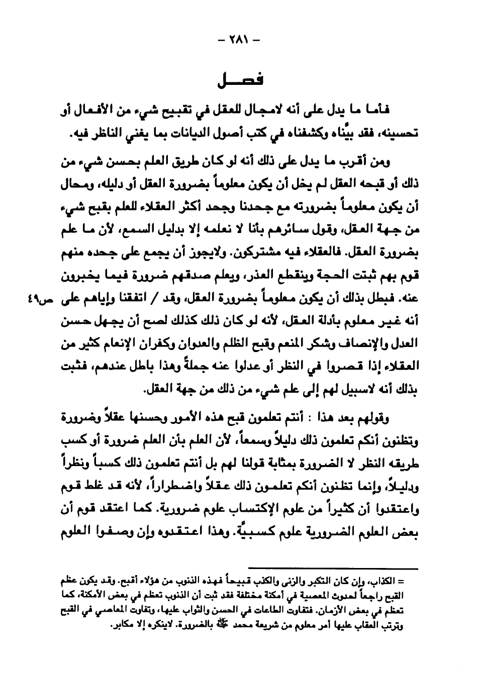 وقولهم بعد هذا: أنتم تعلمون قبح هذه الأمور وحسنها عقلًا وضرورة وتظنون أنكم تعلمون ذلك دليلًا وسمعًا, لأن العلم بأن العلم ضرورة أو كسب طريقه النظر لا الضرورة بمثابة قولنا لهم بل أنتم تعلمون ذلك كسبًا ونظرًا ودليلًا, وإنما تظنون أنكم تعلمون ذلك عقلًا واضطرارًا, لأنه قد غلط قوم واعتقدوا أن كثيرًا من علوم الاكتساب علوم ضرورية, كما اعتقد قوم أن بعض العلوم الضرورية علوم كسبية, وهذا اعتقدوه وإن وصفوا العلوم