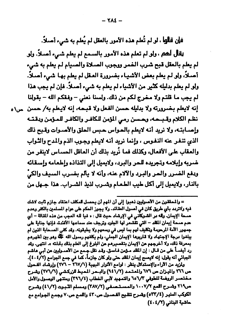 ولو لم يعلم بدليله كثير من الأشياء لم يعلم به شيء أصلًا, فإن لم يجب هذا لم يجب ما قلتم ولا مخرج لكم من ذلك, ولسنا نعني - وفقكم الله - بقولنا إنه لا يعلم بضرورته ولا بدليله حسن الفعل ولا قبحه, إنه لا يعلم به/ ص ٥١ حسن نظم الكلام وقبحه, وحسن رمي المؤمن للكافر والكافر للمؤمن ودقته وإصابته, ولا نريد أنه لا يعلم بالحواس حبس الحلق والأصوات وقبح ذلك الذي تنفر عنه النفوس, وإنما نريد أنه لا يعلم وجوب الذم والمدح والثواب والعقاب على الأفعال, وكذلك فما نريد بذلك أن العاقل الحساس لا ينفر من ضربه وإيلامه وتجريده للحر والبرد, ولا يميل إلى التذاذه وإطعامه وإسقائه ودفع الضرر والحر والبرد والآلام عنه, وأنه لا يألم بضرب السيف والكي بالنار, ولا يميل إلى أكل طيب الطعام وشرب لذيذ الشراب, هذا جهل من