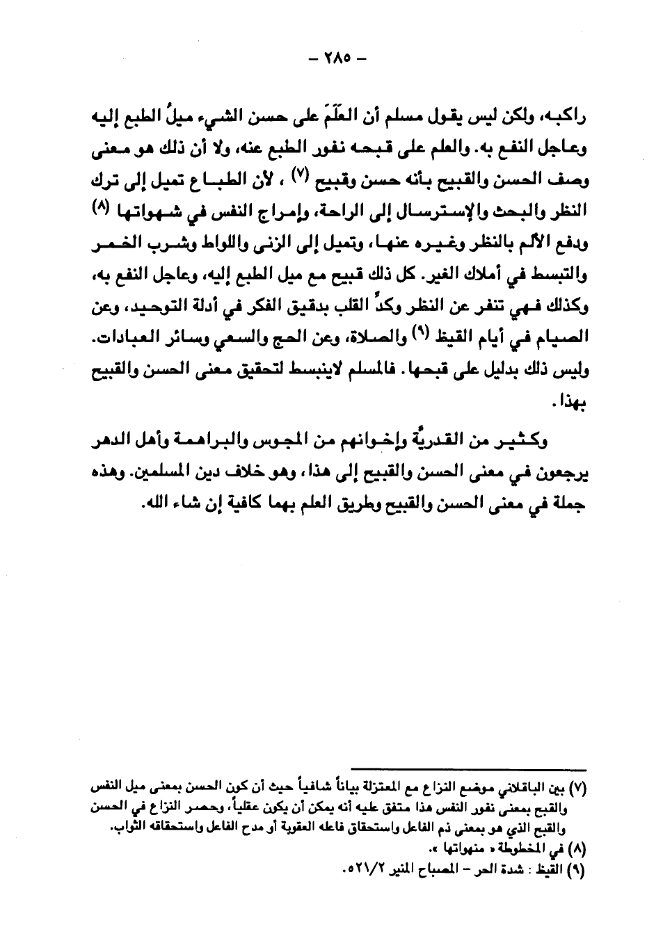 وكثير من القدرية وإخوانهم من المجوس والبراهمة وأهل الدهر يرجعون في معنى الحسن والقبيح إلى هذا, وهو خلاف دين المسلمين, وهذه جملة في معنى الحسن والقبيح وطريق العلم بهما كافية إن شاء الله.