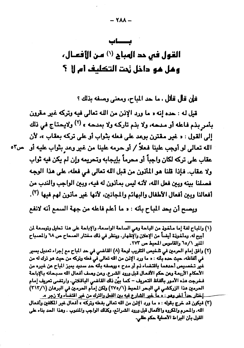 قيل له: حده إنه "ما ورد الإذن من الله تعالى فيه وتركه غير مقرون بأمر بذم فاعله أو مدحه, ولا بذم تاركه ولا بمدحه" ولا يحتاج في ذلك إلى القول: "غير مقترن بوعد على فعله بثواب أو على تركه بعقاب" لأن الله تعالى لو أوجب علينا فعلًا/ ص ٥٣ أو حرمه علينا من غير وعد بثواب عليه أو عقاب على تركه لكان واجبًا أو محرمًا بإيجابه وتحريمه وإن لم يكن فيه ثواب ولا عقاب, فإذا قلنا هو المأذون من قبل الله تعالى في فعله, على هذا الوجه فصلنا بينه وبين فعل الله, لأنه ليس بمأذون له فيه, وبين الواجب والندب من أفعالنا وبين أفعال الأطفال والبهائم والمجانين, لأنها غير مأذون لهم فيها.