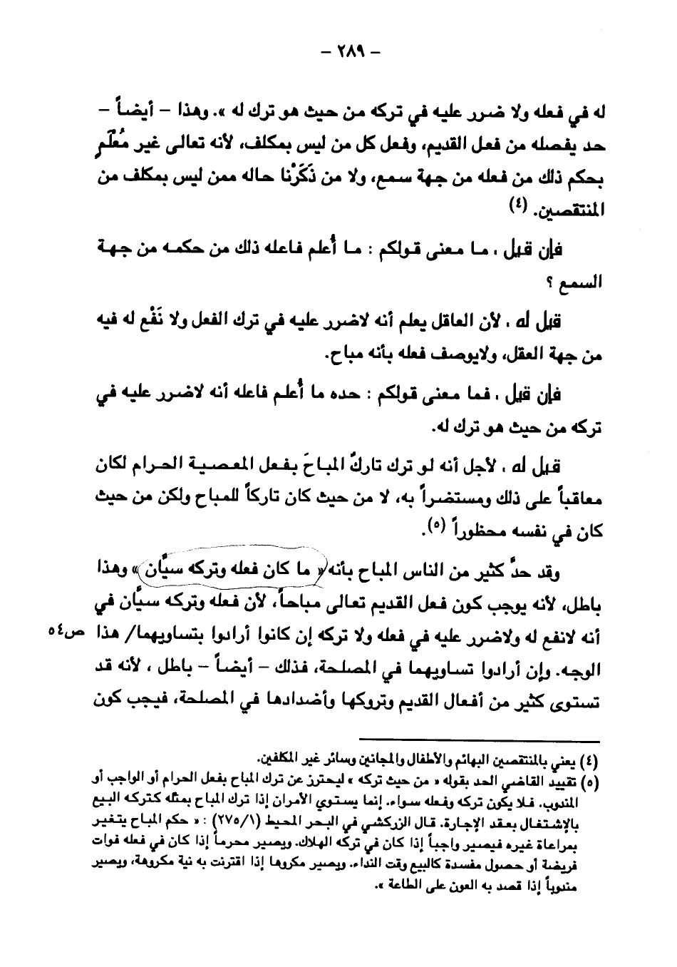 وقد حد كثير من الناس المباح بأنه "ما كان فعله وتركه سيان" وهذا باطل, لأنه يوجب كون فعل القديم تعالى مباحًا, لأن فعله وتركه سيان في أنه لا نفع له ولا ضرر عليه في فعله ولا تركه إن كانوا أرادوا بتساويهما هذا الوجه, وإن أرادوا تساويهما في المصلحة, فذلك - أيضًا - باطل, لأنه قد تستوي كثير من أفعال القديم وتروكها وأضدادها في المصلحة, فيجب كون