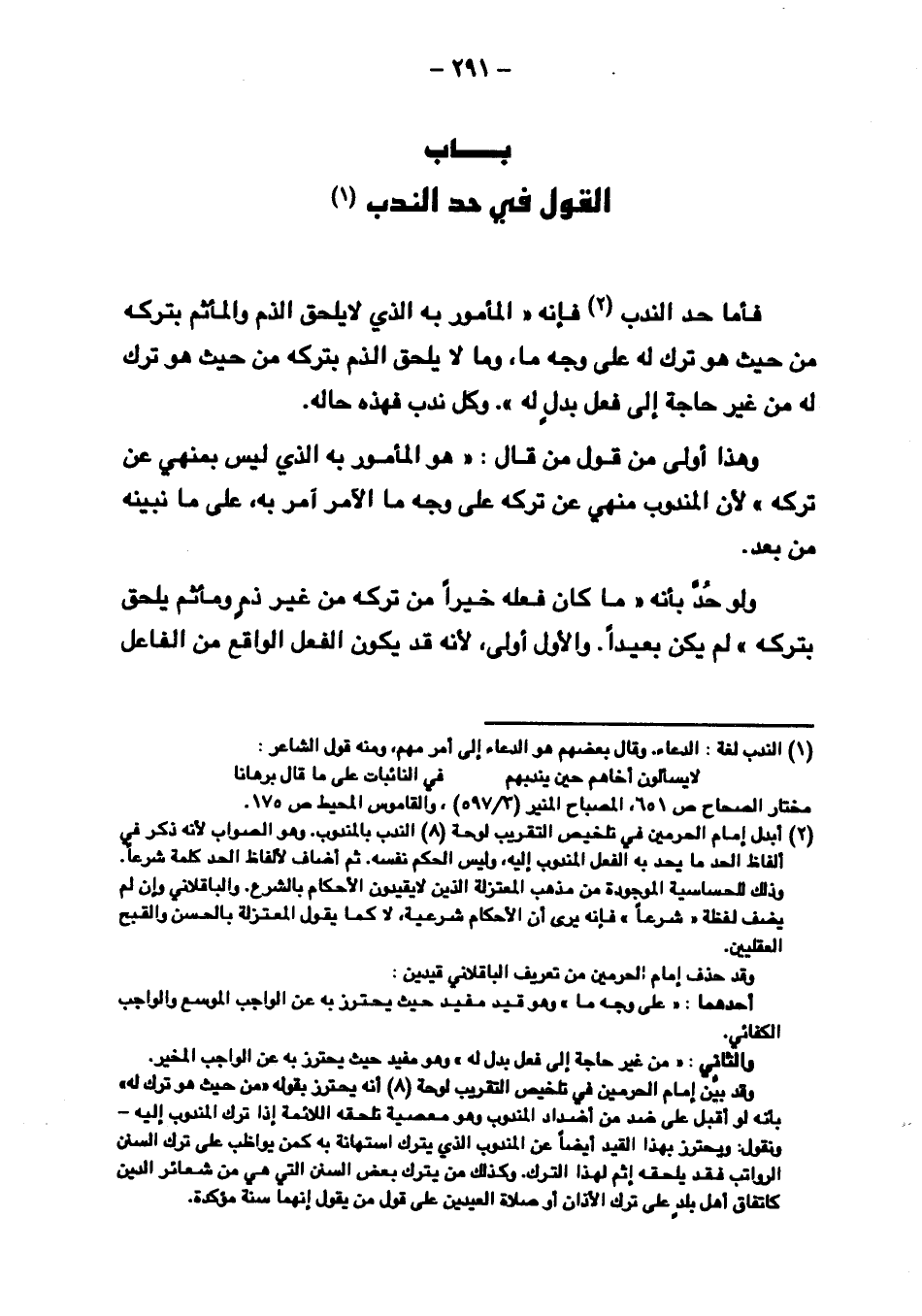 فأما حد الندب فإنه "المأمور به الذي لا يلحق الذم والمأثم بتركه من حيث هو ترك له على وجه ما، وما لا يلحق الذم بتركه من حيث هو ترك له من غير حاجة إلى فعل بدل له". وكل ندب فهذه حاله.