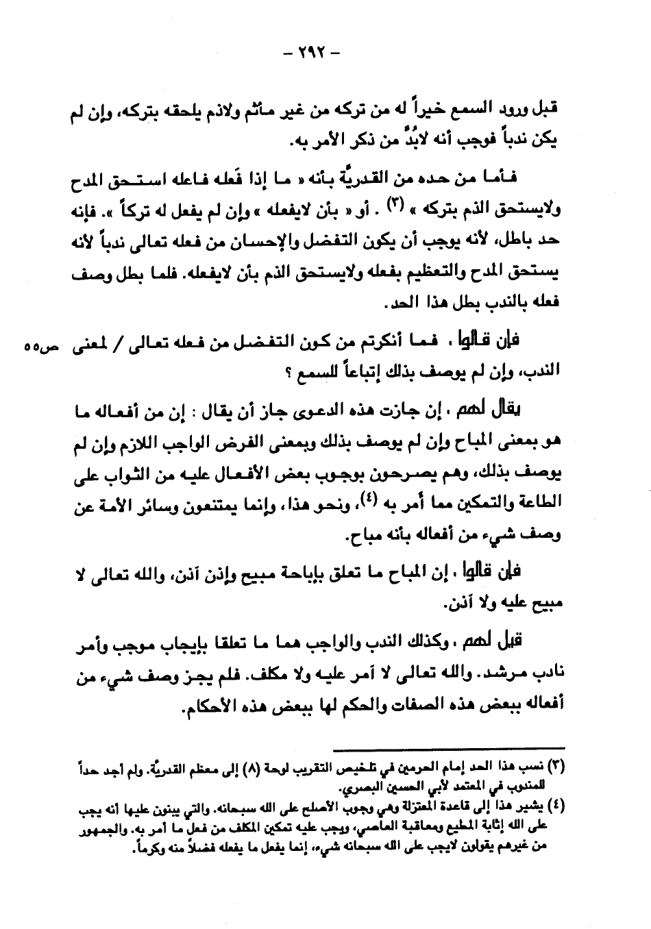 فأما من حده من القدرية بأنه " ما إذا فعله فاعله استحق المدح ولا يستحق الذم بتركه". أو " بأن لا يفعله" وإن لم يفعل له تركاً". فإنه حد باطل، لأنه يوجب أن يكون التفضل والإحسان من فعله تعالى ندباً لأنه يستحق المدح والتعظيم بفعله ولا يستحق الذم بأن لا يفعله. فلما بطل وصف فعله بالندب بطل هذا الحد.