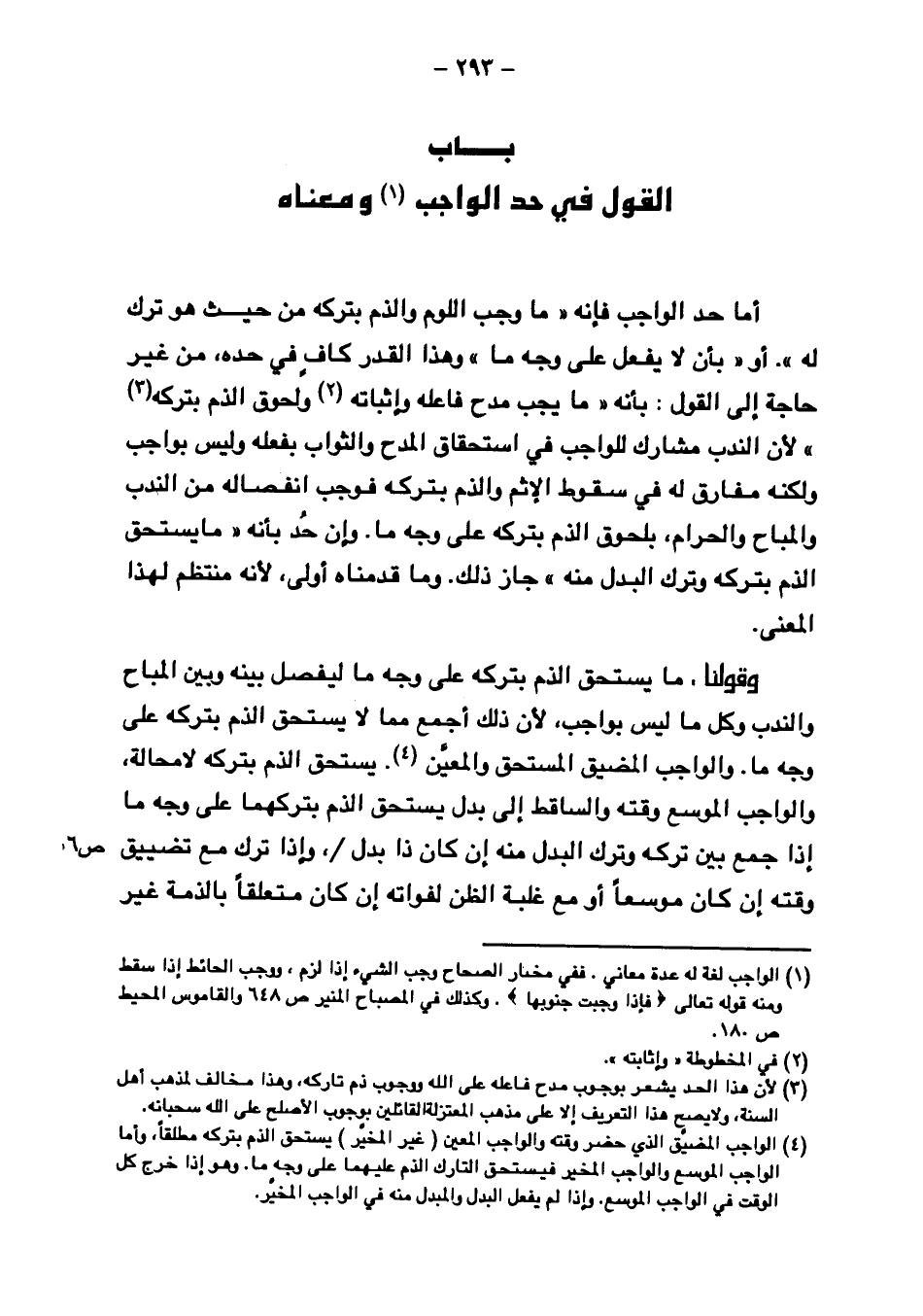وقولنا، ما يستحق الذم بتركه علي وجه ما ليفصل بينه وبين المباح والندب وكل ما ليس بواجب، لأن ذلك أجمع مما لا يستحق الذم بتركه على وجه ما. والواجب المضيق المستحق والمعين. يستحق الذم بتركه لا محالة، والواجب الموسع وقته والساقط إلى بدل يستحق الذم بتركهما على وجه ما إذا جمع بين تركه وترك البدل منه إن كان ذا بدل / ص ٦ وإذا ترك مع تضييق وقته إن كان موسعاً أو مع غلبة الظن لفواته إن كان متعلقاً بالذمة غير