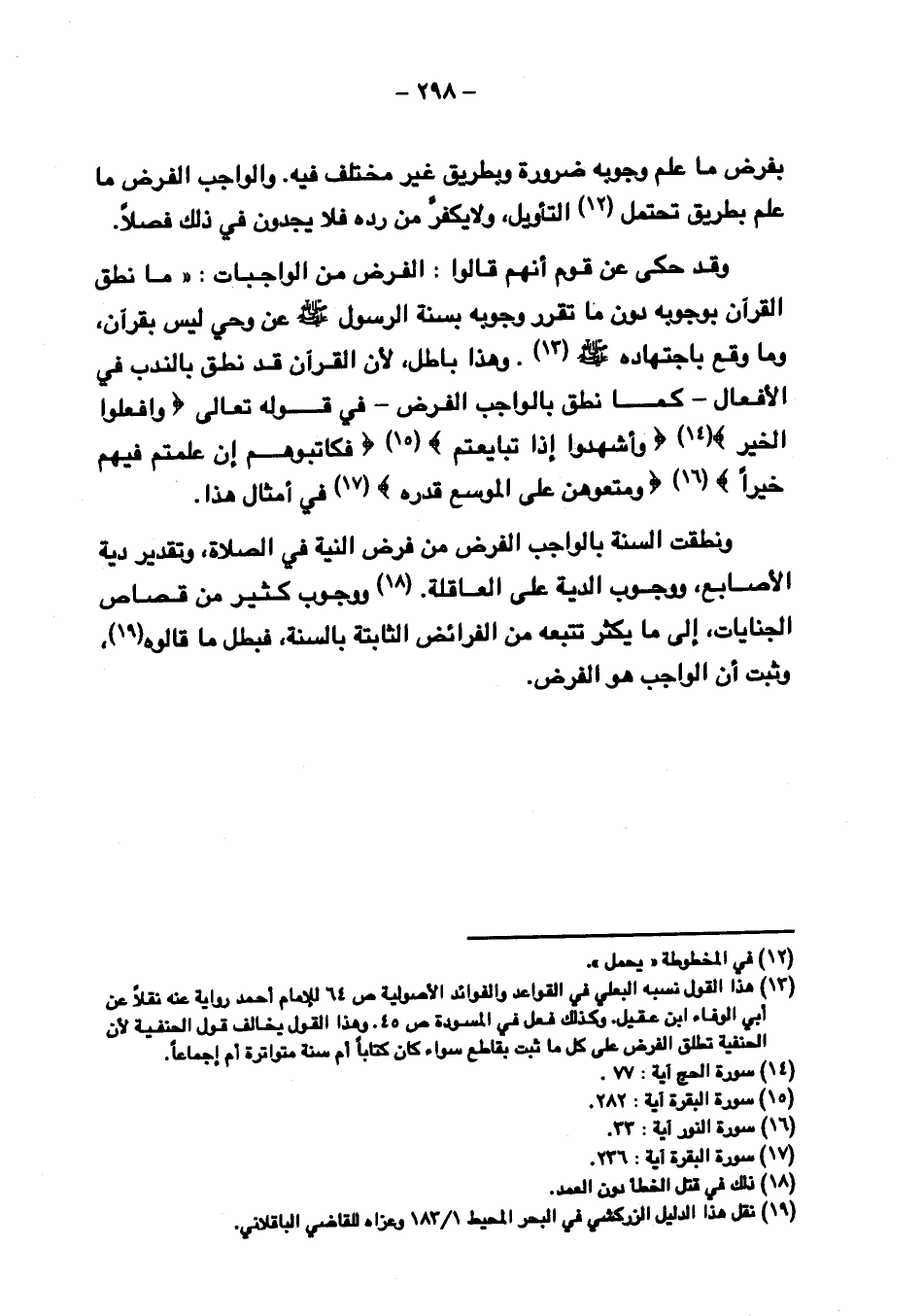 وقد حكي عن قوم أنهم قالوا: الفرض من الواجبات: " ما نطق القرآن بوجوبه دون ما تقرر وجوبه بسنة الرسول صلى الله عليه وسلم عن وحي ليس بقرآن، وما وقع باجتهاده صلى الله عليه وسلم. وهذا باطل، لأن القرآن قد نطق بالندب في الأفعال- كما نطق بالواجب الفرض- في قوله تعالي {وَافْعَلُوا الخَيْرَ} {وأَشْهِدُوا إذَا تَبَايَعْتُمْ} {فَكَاتِبُوهُمْ إنْ عَلِمْتُمْ فِيهِمْ خَيْرًا} {ومَتِّعُوهُنَّ عَلَى المُوسِعِ قَدَرُهُ} في أمثال هذا.