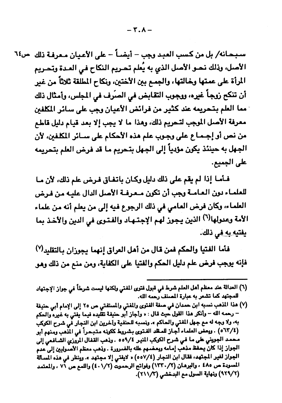 سبحانه/ ص ٦٤ بل من كسب العبد وجب -أيضاً- على الأعيان معرفة ذلك الأصل، وذلك نحو الأصل الذي به يعلم تحريم النكاح في العدة وتحريم المرأة على عمتها وخالتها، والجمع بين الأختين، ونكاح المطلقة ثلاثاً من غير أن تنكح زوجاً غيره، ووجوب التقابض في الصرف في المجلس، وأمثال ذلك مما العلم بتحريمه عند كثير من فرائض الأعيان وجب على سائر المكلفين معرفة الأصل الموجب لتحريم ذلك، وهذا ما لا يجب إلا بعد قيام دليل قاطع أو إجماع على وجوب علم هذه الأحكام على سائر المكلفين، لأن الجهل به حينئذ يكون مؤدياً إلى الجهل بتحريم ما قد فرض العلم بتحريمه على الجميع.