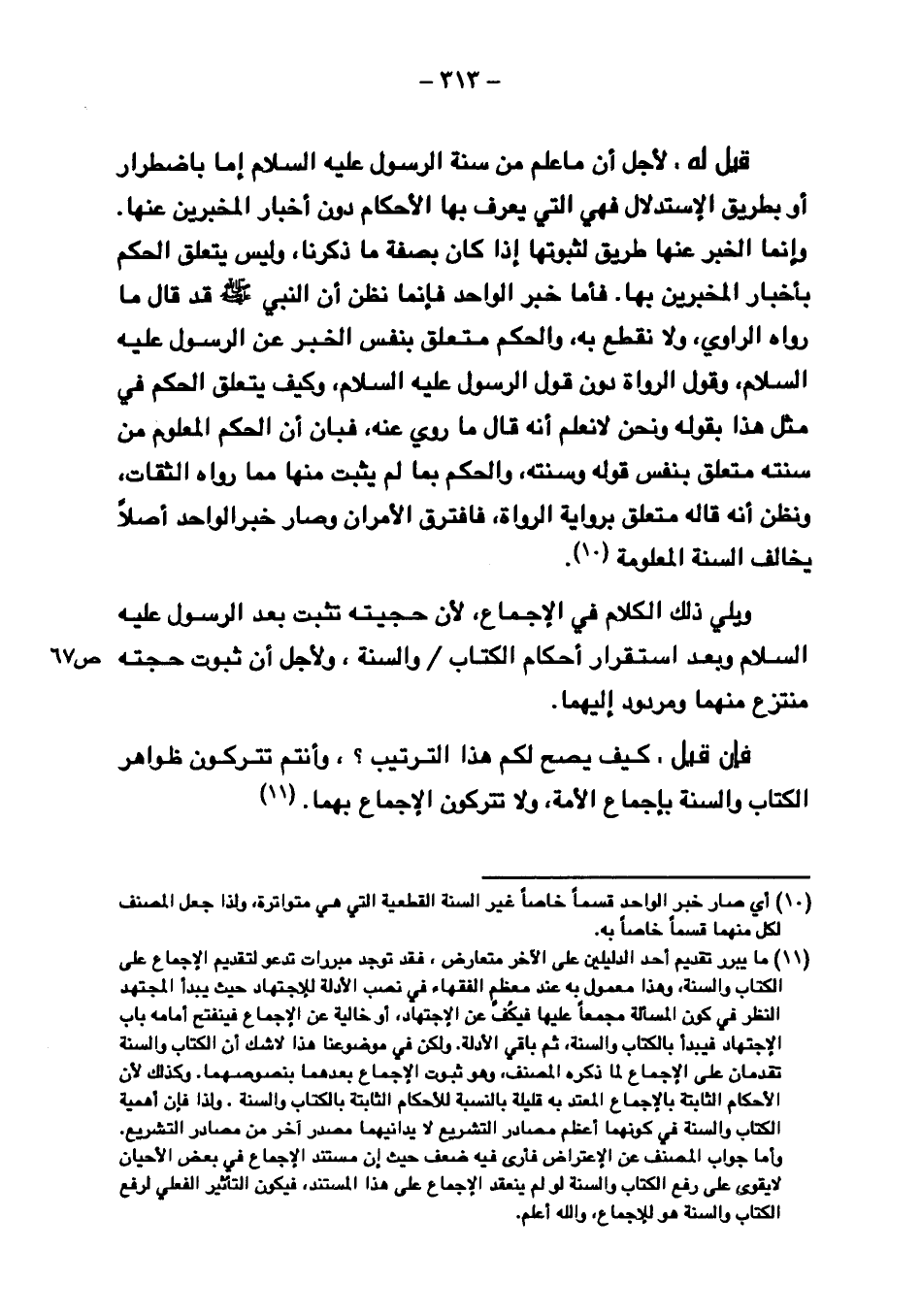 ويلي ذلك الكلام في الإجماع، لأن حجيته تثبت بعد الرسول عليه السلام وبعد استقرار أحكام الكتاب /ص ٦٧ والسنة، ولأجل أن ثبوت حجته منتزع منهما ومردود إليهما.