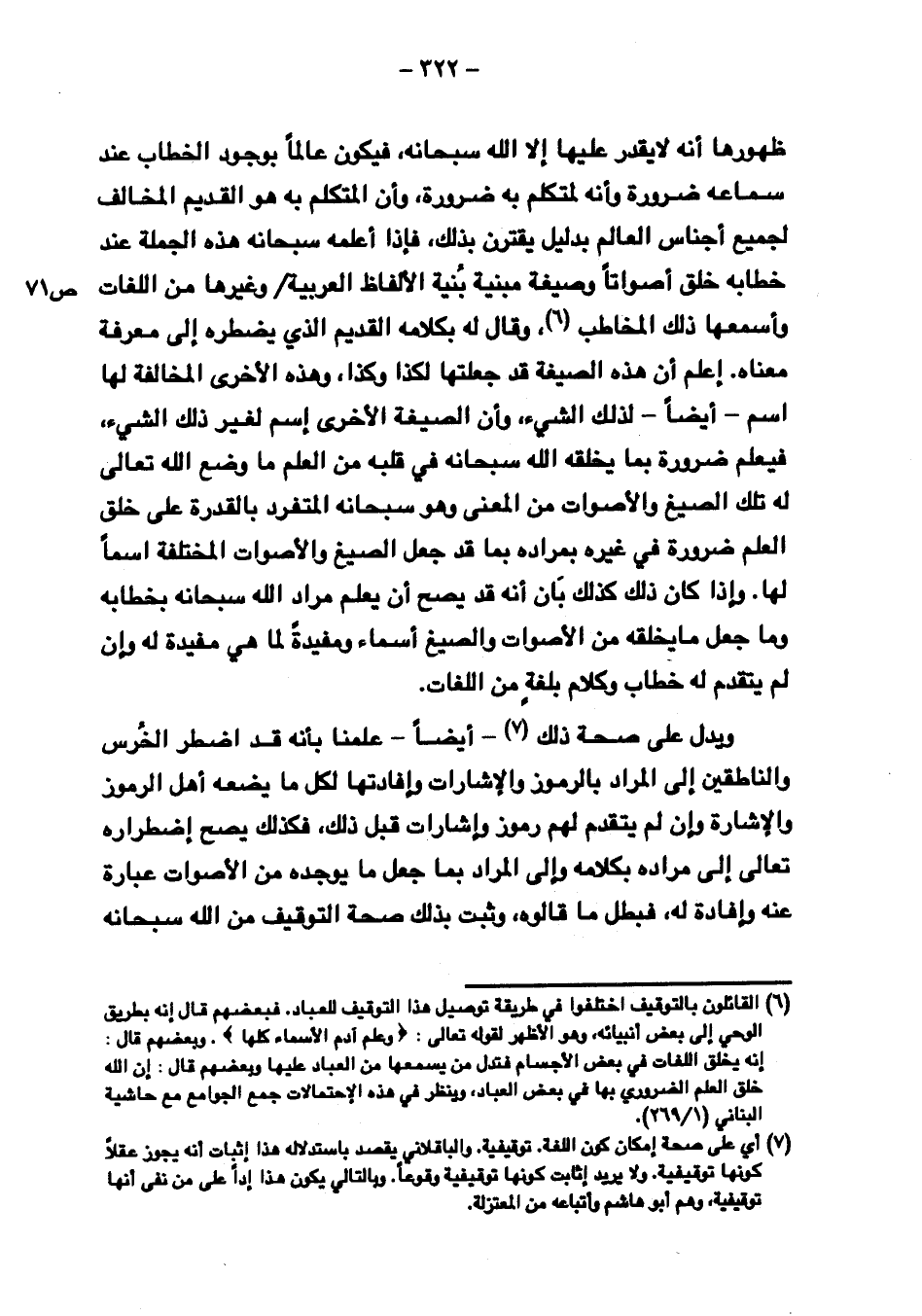 ويدل على صحة ذلك _أيضا_ علمنا بأنه قد اضطر الخرس والناطقين إلى المراد بالرموز والإشارات وإفادتها لكل ما يضعه أهل الرموز والإشارة وإن لم يتقدم لهم رموز وإشارات قبل ذلك، فكذلك يصح اضطراره تعالى إلى مراده بكلامه وإلى المراد بما جعل ما يوجده من الأصوات عبارة عنه وإفادة له، فبطل ما قالوه، وثبت بذلك صحة التوقيف من الله سبحانه