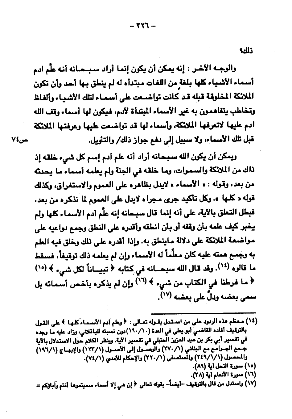 ويمكن أن يكون الله سبحانه أراد أنه علم آدم اسم كل شيء خلقه إذ ذاك من الملائكة والسموات، وما خلقه في الجنة ولم يعلمه أسماء ما يحدثه من بعد، وقوله: "الأسماء" لا يدل بظاهره على العموم والاستغراق، وكذلك قوله "كلها". وكل تأكيد جري مجراه لا يدل على العموم لما نذكره من بعد، فبطل التعلق بالآية، على أنه إنما قال سبحانه إنه علم آدم الأسماء كلها ولم يخبر كيف علمه بأن وقفه أو بأن أنطقه وأقدره على النطق وجمع دواعيه على مواضعه الملائكة على دلالة ما ينطق به. وإذا أقدره على ذلك وخلق فيه العلم به وجمع همته عليه كان معلما له الأسماء وإن لم يعلمه ذلك توقيفا، فسقط ما قالوه. وقد قال الله سبحانه في كتابه {تِبْيَانًا لِّكُلِّ شَيْءٍ} {مَّا فَرَّطْنَا فِي الكِتَابِ مِن شَيْءٍ} وإن لم يذكره بأخص أسمائه بل سمى بعضه ودل على بعضه.