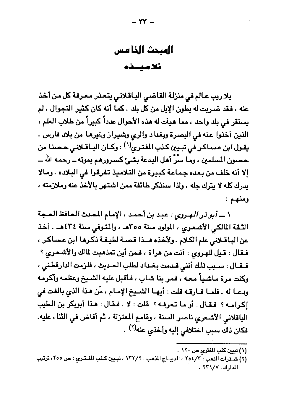 ١ - أبو ذر الهروي: عبد بن أحمد، الإمام المحدث الحافظ الحجة الثقة المالكي الأشعري، المولود سنة ٣٥٥ هـ، والمتوفى سنة ٣٢٣ هـ. أخذ عن الباقلاني علم الكلام. ولأخذه هذا قصة لطيفة ذكرها ابن عساكر، فقال: قيل للهروي: أنت من هراة، فمن أين تمذهبت لمالك والأشعري؟ فقال: سبب ذلك أنني قدمت بغداد لطلب الحديث، فلزمت الدارقطني، وكنت مرة ماشيًا معه، فمر بنا شاب، فأقبل عليه الشيخ وعظمه وأكرمه ودعا له. فلما فارقه قلت: أيها الشيخ الإمام، من هذا الذي بالغت في إكرامه؟ فقال: أو ما تعرفه؟ قلت: لا. فقال: هذا أبو بكر بن الطيب الباقلاني الأشعري ناصر السنة، وقامع المعتزلة، ثم أفاض في الثناء عليه. فكان ذلك سبب اختلافي إليه وأخذي عنه.