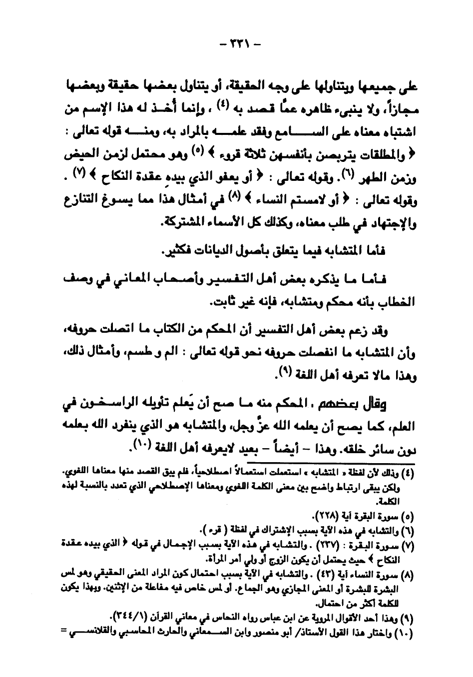 على جميعها ويتناولها على وجه الحقيقة, أو يتناول بعضها حقيقة وبعضها مجازًا, ولا ينبئ ظاهره عما قصد به, وإنما أخذ له هذا الاسم من اشتباه معناه على السامع وفقد علمه بالمراد به, ومنه قوله تعالى: {والْمُطَلَّقَاتُ يَتَرَبَّصْنَ بِأَنفُسِهِنَّ ثَلاثَةَ قُرُوءٍ} وهو محتمل لزمن الحيض وزمن الطهر. وقوله تعالى: {أَوْ يَعْفُوَ الَّذِي بِيَدِهِ عُقْدَةُ النِّكَاحِ}. وقوله تعالى: {أَوْ لامَسْتُمُ النِّسَاءَ} في أمثال هذا مما يسوغ التنازع والاجتهاد في طلب معناه, وكذلك كل الأسماء المشتركة.