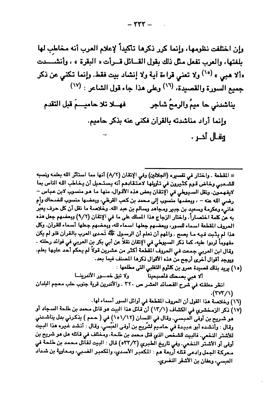 وإن اختلفت نظومها, وإنما كرر ذكرها تأكيدًا لإعلام العرب أنه مخاطب لها بلغتها, والعرب تفعل مثل ذلك بقول القائل قرأت "البقرة", وأنشدت "ألا هبي" ولا تعني قراءة آية ولا إنشاد بيت فقط. وإنما تكني عن ذكر جميع السورة والقصيدة, وعلى هذا جاء قول الشاعر:
