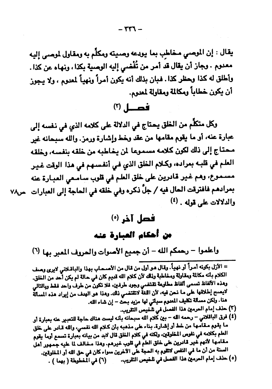 وكل متكلم من الخلق يحتاج في الدلالة على كلامه الذي في نفسه إلى عبارة عنه, أو ما يقوم مقامها من عقد وخط وإشارة ورمز. والله سبحانه غير محتاج إلى ذلك لكون كلامه مسموعًا لمن يخاطبه من خلقه بنفسه, وخلقه العلم في قلبه بمراده, وكلام الخلق الذي في أنفسهم في هذا الوقت غير مسموع, وهم غير قادرين على خلق العلم في قلوب سامعي العبارة عنه بمرادهم فافترقت الحال فيه/ ص ٧٨ جل ذكره وفي خلقه في الحاجة إلى العبارات والدلالات على قوله.
