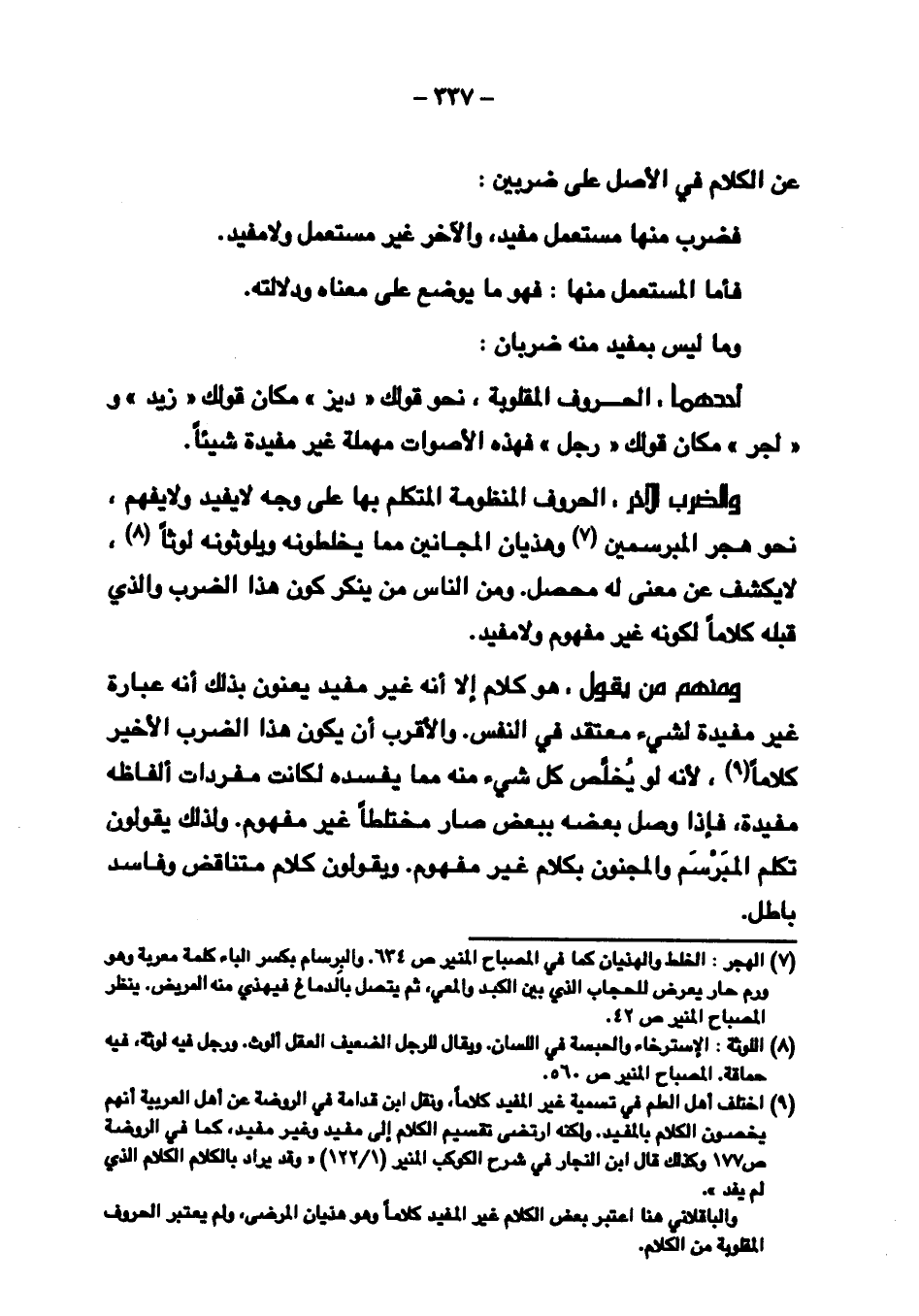 ومنهم من يقول: هو كلام إلا أنه غير مفيد يعنون بذلك أنه عبارة غير مفيدة لشيء معتقد في النفس. والأقرب أن يكون هذا الضرب الأخير كلامًا, لأنه لو يُخلص كل شيء منه مما يفسده لكانت مفردات ألفاظه مفيدة, فإذا وصل بعضه ببعض صار مختلطًا غير مفهوم. ولذلك يقولون تكلم المبرسم والمجنون بكلام غير مفهوم. ويقولون كلام متناقض وفاسد باطل.
