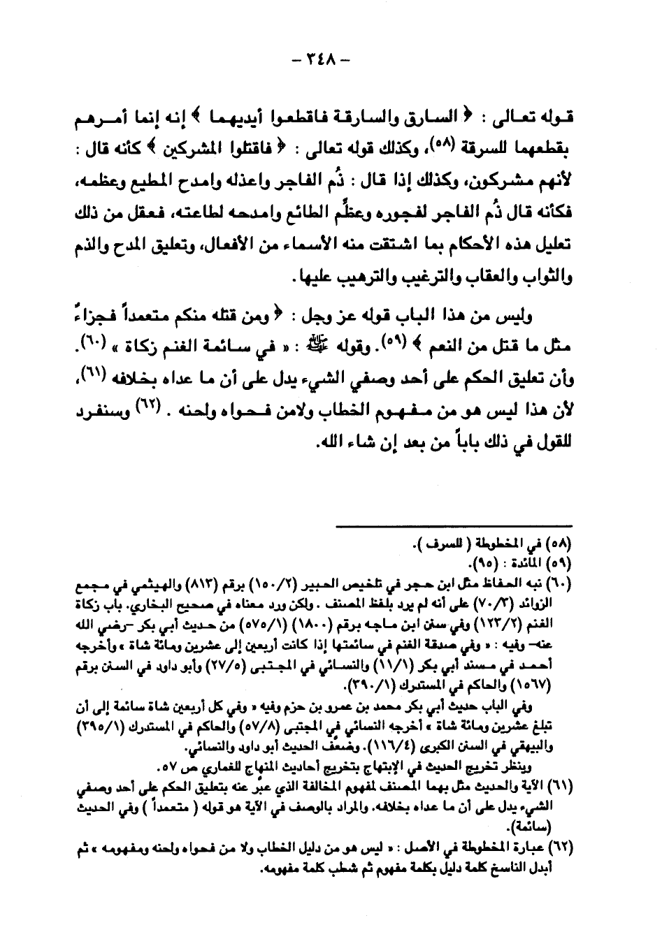 قوله تعالى: {والسَّارِقُ والسَّارِقَةُ فَاقْطَعُوا أَيْدِيَهُمَا} إنه إنما أمرهم بقطعهما للسرقة, وكذلك قوله تعالى: {فَاقْتُلُوا المُشْرِكِينَ} كأنه قال: لأنهم مشركون, وكذلك إذا قال: ذم الفاجر واعذله وامدح المطيع وعظمه, فكأنه قال ذم الفاجر لفجوره عظم الطائع وامدحه لطاعته, فعقل من ذلك تعليل هذه الأحكام بما اشتقت منه الأسماء من الأفعال, وتعليق المدح والذم والثواب والعقاب والترغيب والترهيب عليها.