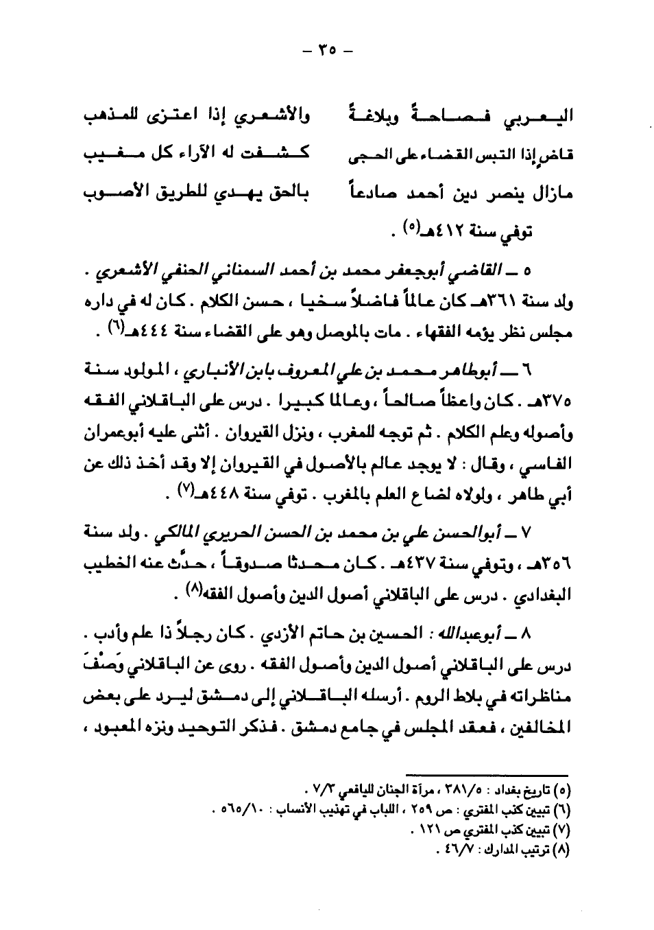 ٥ - القاضي أبو جعفر محمد بن أحمد السمناني الحنفي الأشعري. ولد سنة ٣٦١ هـ كان عالمًا فاضلًا سخيًا، حسن الكلام. كان له في داره مجلس نظر يؤمه الفقهاء. مات بالموصل وهو على القضاء سنة ٤٤٤ هـ.