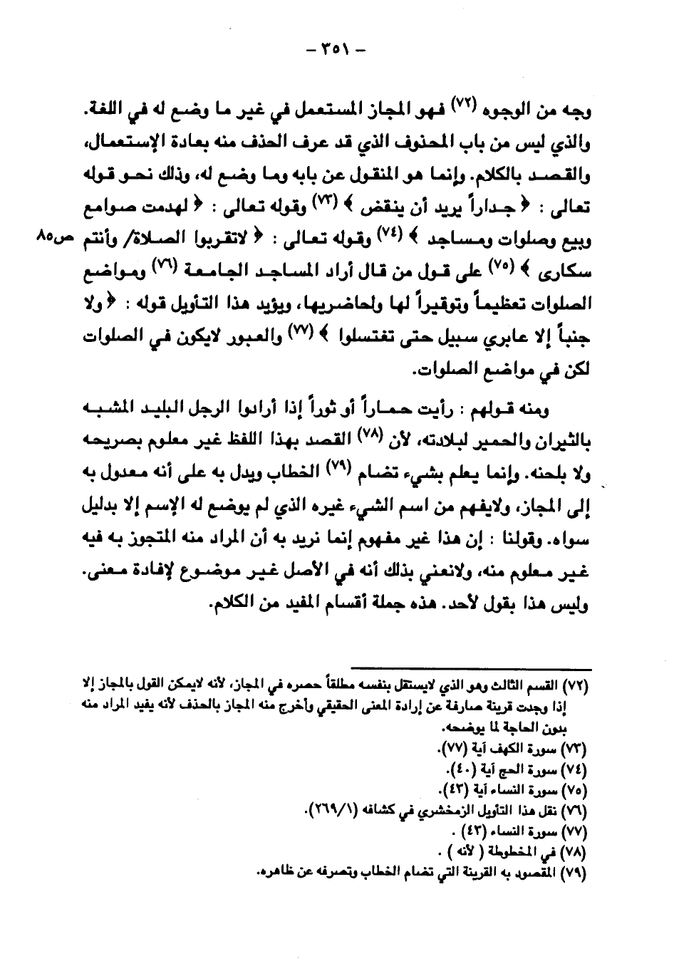 وجه من الوجوه فهو المجاز المستعمل في غير ما وضع له في اللغة. والذي ليس من باب المحذوف الذي قد عرف الحذف منه بعادة الاستعمال, والقصد بالكلام. وإنما هو المنقول عن بابه وما وضح له, وذلك نحو قوله تعالى: {جِداَرًا يُرِيدُ أَن يَنقَضَّ} وقوله تعالى: {لَّهُدِّمَتْ صَوَامِعُ وَبِيَعٌ وَصَلَوَاتٌ وَمَسَاجِدُ} وقوله تعالى: {لا تَقْرَبُوا الصَّلاةَ وأَنتُمْ سُكَارَى} ص ٨٥ على قول من قال أراد المساجد الجامعة ومواضع الصلوات تعظيمًا وتوقيرًا لها ولحاضريها, ويؤيد هذا التأويل قوله: {ولا جُنُبًا إلاَّ عَابِرِي سَبِيلٍ حَتَّى تَغْتَسِلُوا} والعبور لا يكون في الصلوات لكن في مواضع الصلوات.
