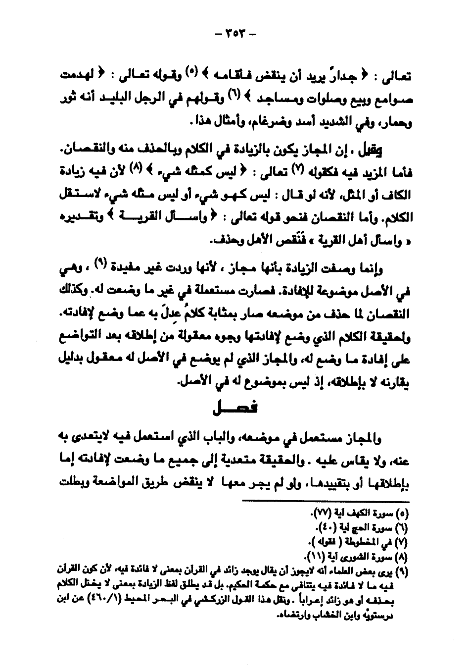 تعالى: {جِداَرًا يُرِيدُ أَن يَنقَضَّ فَأَقَامَهُ} وقوله تعالى: {لَّهُدِّمَتْ صَوَامِعُ وَبِيَعٌ وَصَلَوَاتٌ وَمَسَاجِدُ} وقولهم في الرجل البليد أنه ثور وحمار, وفي الشديد أسد وضرغام, وأمثال هذا.