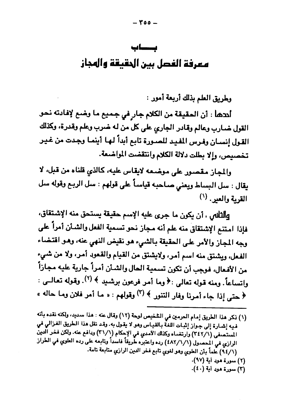 والثاني: أن يكون ما جرى عليه الاسم حقيقة يستحق منه الاشتقاق, فإذا امتنع الاشتقاق منه علم أنه مجاز نحو تسمية الفعل والشأن أمرًا على وجه المجاز والأمر على الحقيقة بالشيء هو نقيض النهي عنه, وهو اقتضاء الفعل, ويشتق منه اسم أمر, ولا يشتق من القيام وقعود أمر, ولا من شيء من الأفعال, فوجب أن تكون تسمية الحال والشأن أمرًا جارية عليه مجازًا واتساعًا. ومنه قوله تعالى: {ومَا أَمْرُ فِرْعَوْنَ بِرَشِيدٍ}. وقوله تعالى: {حَتَّى إذَا جَاءَ أَمْرُنَا وفَارَ التَّنُّورُ} وقولهم:"ما أمر فلان وما حاله"