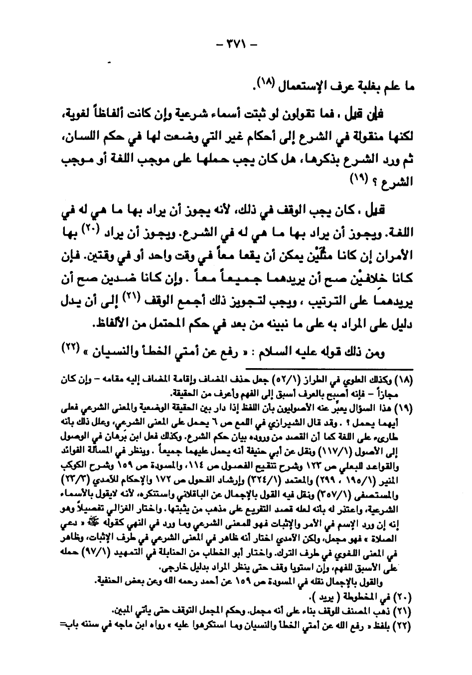 قيل، كان يجب الوقف في ذلك، لأنه يجوز أن يراد بها ما هي له في اللغة. ويجوز أن يراد بها ما هي له في الشرع. ويجوز أن يراد بها الأمران إن كانا مثلين يمكن أن يقعا معًا في وقت واحد أو في وقتين. فإن كانا خلافين صح أن يريدهما جميعًا معًا. وإن كانا ضدين صح أن يريدهما على الترتيب، ويجب لتجويز ذلك أجمع الوقف إلى أن يدل دليل على المراد به على منا نبينه من بعد في حكم المحتمل من الألفاظ.