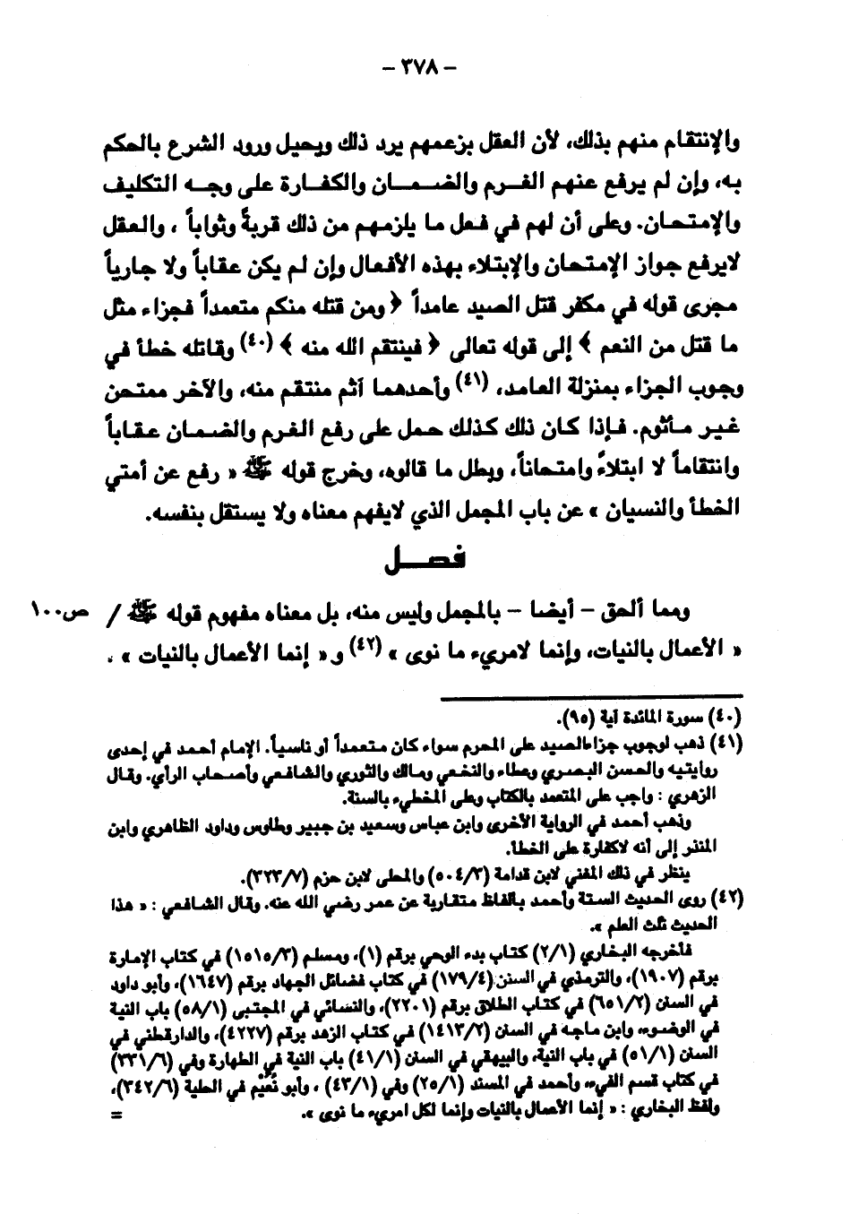 والانتقام منهم بذلك، لأن العقل بزعمهم يرد ذلك ويحيل ورود الشرع بالحكم به، وإن لم يرفع عنهم الغرم والضمان والكفارة على وجه التكليف والامتحان. وعلى أن لهم في فعل ما يلزمهم من ذلك قربةً وثوابًا، والعقل لا يرفع جواز الامتحان والابتلاء بهذه الأفعال وإن لم يكن عقابًا ولا جاريًا مجرى قوله في مكفر قتل الصيد عامدًا {ومَن قَتَلَهُ مِنكُم مُّتَعَمِّدًا فَجَزَاءٌ مِّثْلُ مَا قَتَلَ مِنَ النَّعَمِ} إلى قوله تعالى {فَيَنتَقِمُ اللَّهُ مِنْهُ} وقاتله خطأ وجوب الجزاء بمنزلة العامد، أحدهما آثم منتقم منه، والآخر ممتحن غير مأثوم. فإذا كان ذلك كذلك حمل على رفع الغرم والضمان عقابًا وانتقامًا لا ابتلاءً وامتحانًا، وبطل ما قالوه، وخرج قوله صلى الله عليه وسلم "رفع عن أمتي الخطأ والنسيان" عن باب المجعل الذي لا يفهم معناه ولا يستقل بنفسه.