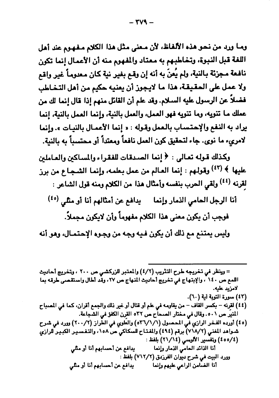 وما ورد من نحو هذه الألفاظ، لأن معنى مثل هذا الكلام مفهوم عند أهل اللغة قبل النبوة، وتخاطبهم به معتاد والمفهوم منه أن الأعمال إنما تكون نافعة مجزئة بالنية، ولم يُعن به أنه إن وقع بغير نية كان معدومًا غير واقع ولا عمل على الحقيقة، هذا ما لا يجوز أن يعينه حكيم من أهل التخاطب فضلًا عن الرسول عليه السلام. وقد علم أن القائل منهم إذا قال إنما لك من عملك ما تنويه، وما تنويه فهو العمل، والعمل بالنية، وإنما العمل بالنية، إنما يراد به النفع والاحتساب بالعمل وقوله: "إنما الأعمال بالنيات". وإنما لامرئ ما نوى. جاء لتحقيق كون العمل نافعًا ومعتدًا أو محتسبًا به بالنية.
