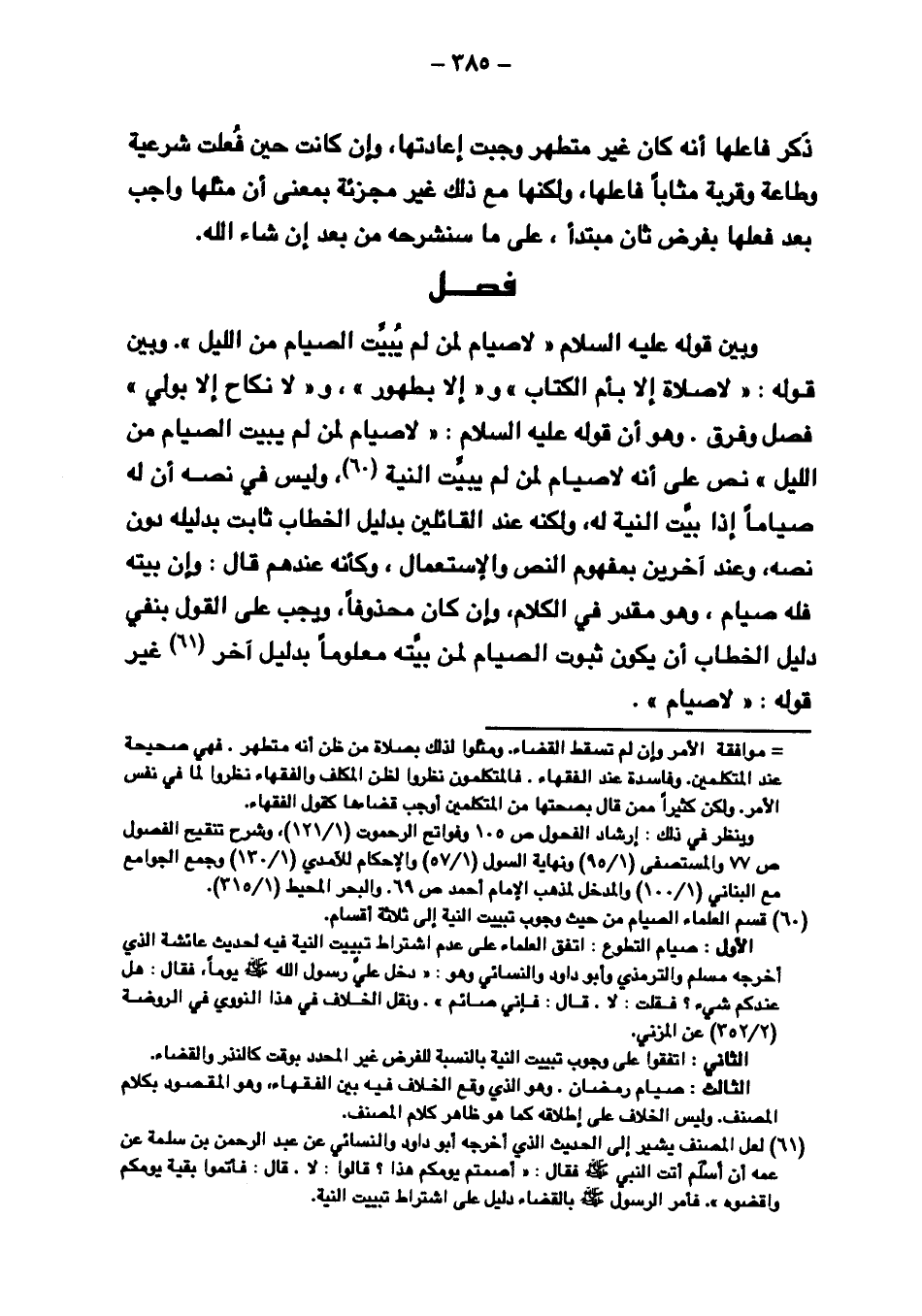 وبين قوله عليه السلام "لا صيام لمن لم يُبيت الصيام من الليل". وبين قوله: "لا صلاة إلا بأم الكتاب" و "إلا بطهور"، و "لا نكاح إلا بولي" فصل وفرق. وهو أن قوله عليه السلام: "لا صيام لمن لم يبيت الصيام من الليل" نص على أنه لا صيام لمن لم يبيت النية، وليس في نصه أن له صيامًا إذا بيت النية له، ولكنه عند القائلين بدليل الخطاب ثابت بدليله دون نصه، وعند آخرين بمفهوم النص والاستعمال، وكأنه عندهم قال: وإن بيته فله صيام، وهو مقدر في الكلام، وإن كان محذوفًا، ويجب على القول بنفي دليل الخطاب أن يكون ثبوت الصيام لمن بيته معلومًا بدليل آخر غير قوله: "لا صيام".