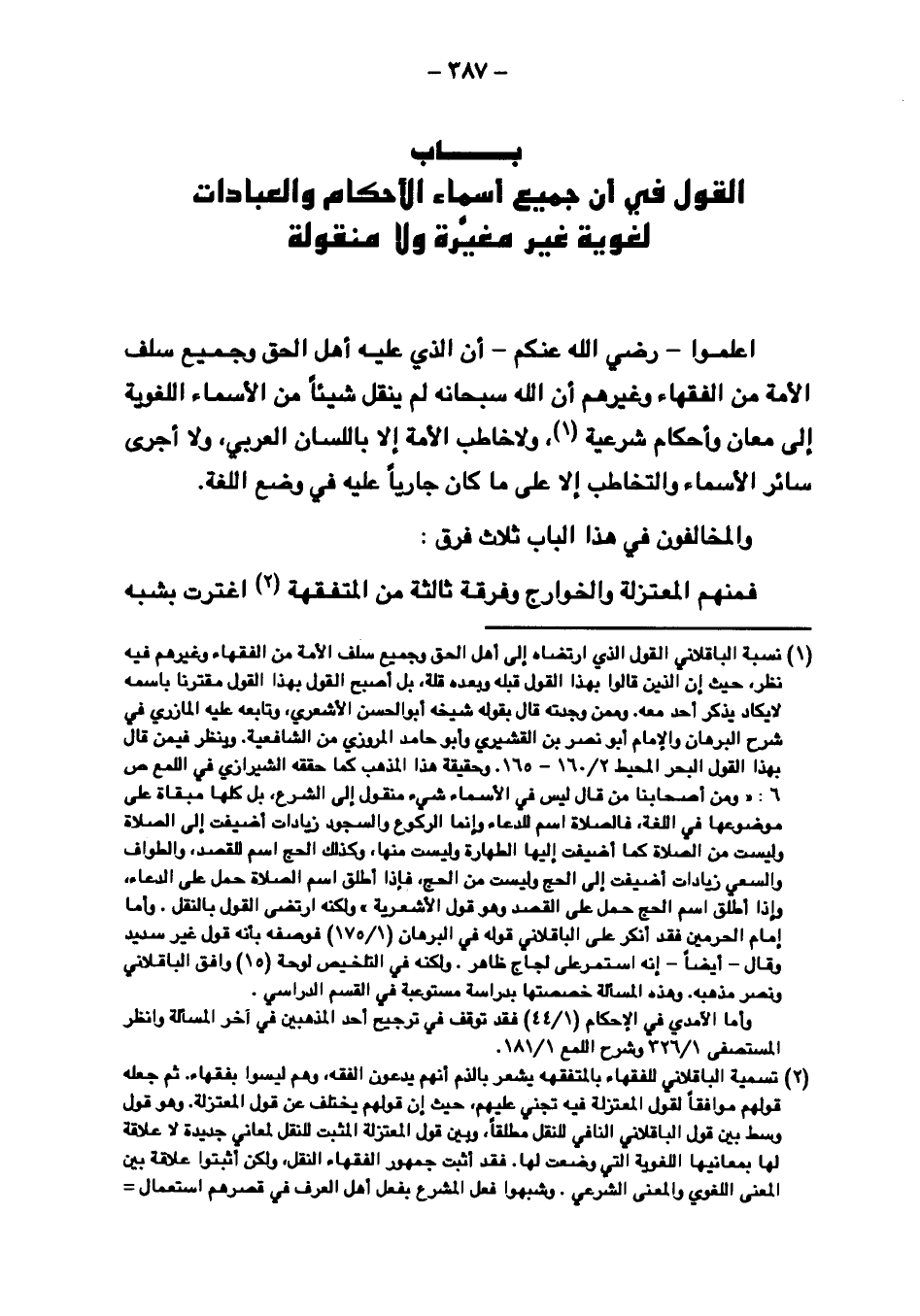 اعلموا - رضي الله عنكم - أن الذي عليه أهل الحق وجميع سلف الأمة من الفقهاء وغيرهم أن الله سبحانه لم ينقل شيئًا من الأسماء اللغوية إلى معان وأحكام شرعية، ولا خاطب الأمة إلا باللسان العربي، ولا أجرى سائر الأسماء والتخاطب إلا على ما كان جاريًا عليه في وضع اللغة.