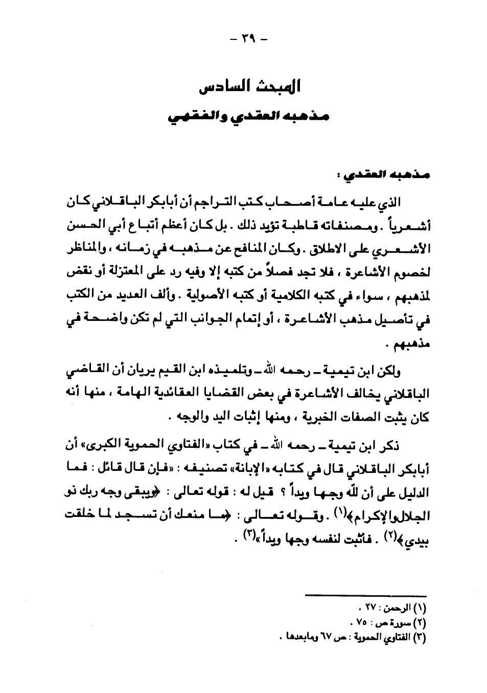 ذكر ابن تيمية - رحمه الله - في كتاب "الفتاوي الحموية الكبرى" أن أبا بكر الباقلاني قال في كتابه "الإبانة" تصنيفه: "فإن قال قائل: فما الدليل على أن لله وجهًا ويدًا؟ قيل له: قوله تعالى: {ويَبْقَى وجْهُ رَبِّكَ ذُو الجَلالِ والإكْرَامِ}. وقوله تعالى: {مَا مَنَعَكَ أَن تَسْجُدَ لِمَا خَلَقْتُ بِيَدَيَّ}. فأثبت لنفسه وجهًا ويدًا".