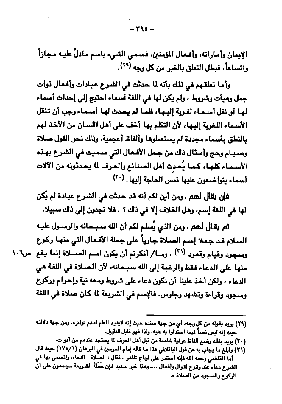 وأما تعلقهم في ذلك بأنه لما حدثت في الشرع عبادات وأفعال ذوات جمل وهيأت وشروط، ولم يكن لها في اللغة أسماء احتيج إلى إحداث أسماء لها أو نقل أسماء لغوية إليها، فلما لم يحدث لها أسماء وجب أن تنقل الأسماء اللغوية إليها، لأن التكلم بها أخف على أهل اللسان من الأخذ لهم بالنطق بأسماء مجددة لم يستعملوها وألفاظ أعجمية، وذلك نحو القول صلاة وصيام وحج وأمثال ذلك من جمل الأفعال التي سميت في الشرع بهذه الأسماء كلها، كما يُحدث أهل الصنائع والحرف لما يحدثونه من الآلات أسماء يتواضعون عليها تمس الحاجة إليها.
