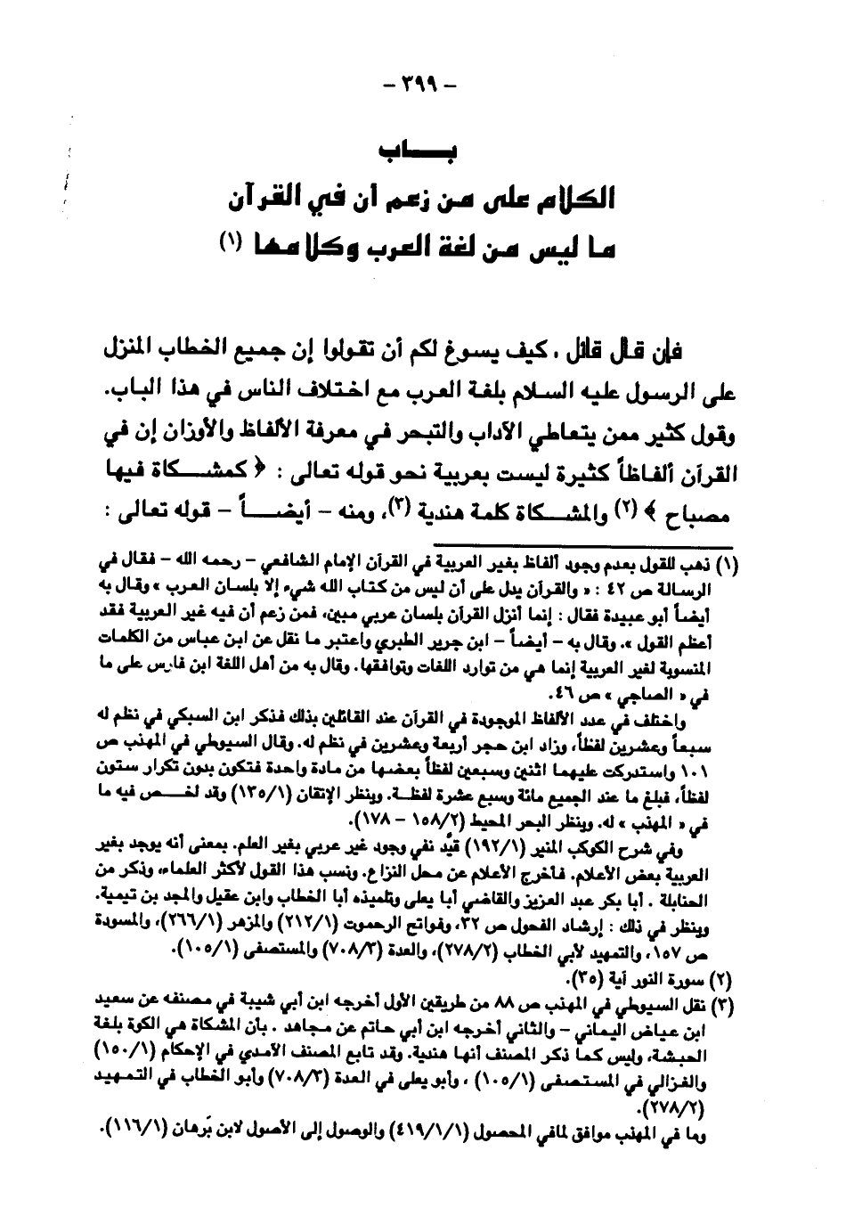 فإن قال قائل: كيف يسوغ لكم أن تقولوا إن جميع الخطاب المنزل على الرسول عليه السلام بلغة العرب مع اختلاف الناس في هذا الباب. وقول كثير ممن يتعاطي الآداب والتبحر في معرفة الألفاظ والأوزان إن في القرآن ألفاظًا كثيرة ليست بعربية نحو قوله تعالى: {كَمِشْكَاةٍ فِيهَا مِصْبَاحٌ} والمشكاة كلمة هندية، ومنه - أيضًا - قوله تعالى: