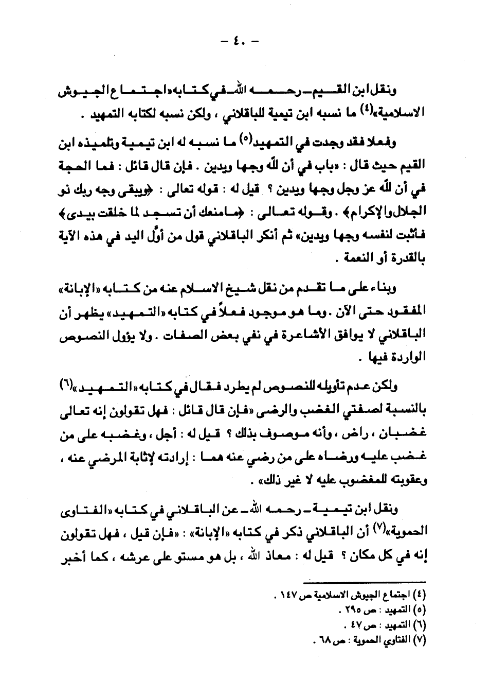 ونقل ابن القيم - رحمه الله - في كتابه "اجتماع الجيوش الإسلامية" ما نسبه ابن تيمية للباقلاني، ولكن نسبه لكتابه التمهيد.