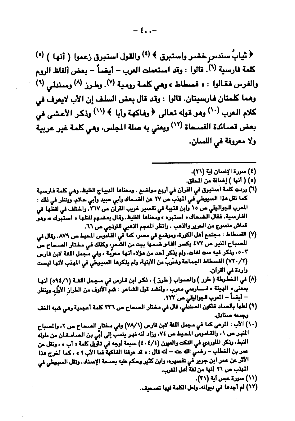 {ثِيَابُ سُنْدُسٍ خُضْرٌ وَإِسْتَبْرَق} والقول إستبرق زعموا (أنها) كلمة فارسية. قالوا: وقد استعملت العرب - أيضًا - بعض ألفاظ الروم والفرس فقالوا: "فسطاط" وهي كلمة رومية. وطرز وسندلي وهما كلمتان فارسيتان. قالوا: وقد قال بعض السلف إن الأب لا يعرف في كلام العرب وهو قوله تعالى {وفَاكِهَةً وأَبًا} وذكر الأعشى في بعض قصائده الفسحاة ويعني به صلة المجلس، وهي كلمة غير عربية ولا معروفة في اللسان.