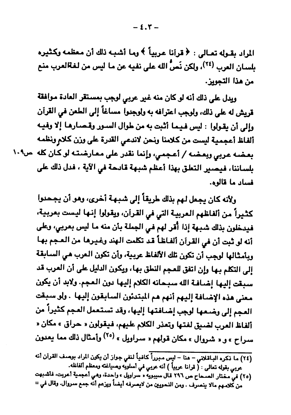 ولأنه كان يجعل لهم بذلك طريقًا إلى شبهة أخرى، وهو أن يجحدوا كثيرًا من ألفاظهم العربية التي في القرآن، ويقولوا إنها ليست بعربية، فيدخلون بذلك شبهة إذا أقر لهم في الجملة بأن منه ما ليس بعربي، وعلى أنه لو ثبت أن في القرآن ألفاظًا قد تكلمت الهند وغيرها من العجم بها وبأمثالها لوجب أن تكون تلك الألفاظ عربية، وأن تكون العرب هي السابقة إلى التكلم بها وإن اتفق للعجم النطق بها، ويكون الدليل على أن العرب قد سبقت إليها إضافة الله سبحانه الكلام إليها دون العجم. ولابد أن يكون معنى هذا الإضافة إليهم أنهم هم المبتدئون السابقون إليها. ولو سبقت العجم إلى وضعها لوجب إضافتها إليها، وقد تستعمل العجم كثيرًا من ألفاظ العرب لضيق لغتها وتعذر الكلام عليهم، فيقولون "حراق" مكان "سراح" و "شروال" مكان قولهم "سراويل" وأمثال ذلك مما يعدون