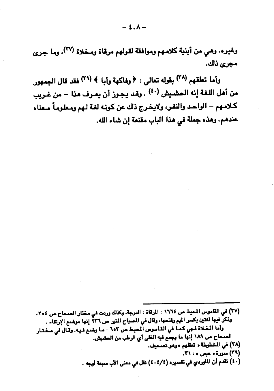 وأما تعلقهم بقوله تعالى: {وفَاكِهَةً وأَبًا} فقد قال الجمهور من أهل اللغة إنه الحشيش. وقد يجوز أن يعرف هذا - من غريب كلامهم - الواحد والنفر، ولا يخرج ذلك عن كونه لغة لهم ومعلومًا معناه عندهم. وهذا جملة في هذا الباب مقنعة إن شاء الله.