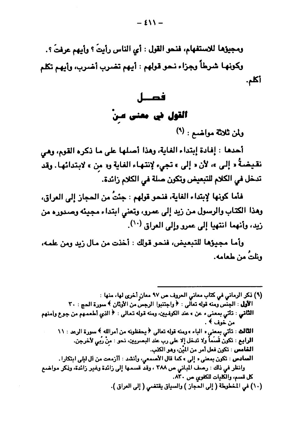 أحدها: إفادة ابتداء الغاية، وهذا أصلها على ما ذكره القوم، وهي نقيضة "إلى"، لأن "إلى" تجيء لانتهاء الغاية و"من" لابتدائها. وقد تدخل في الكلام للتعبيض وتكون صلة في الكلام زائدة.