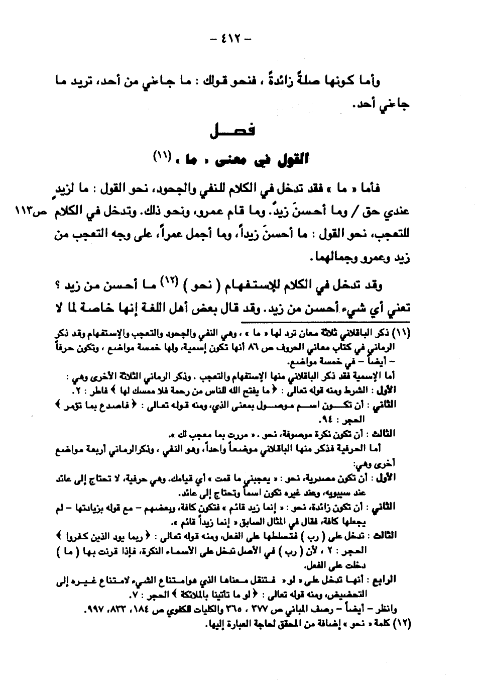 فأما "ما" فقد تدخل في الكلام للنفي والجحود، نحو القول: ما لزيدٍ عندي حق/ ص ١١٣ وما أحسن زيدٌ. وما قام عمرو، ونحو ذلك. وتدخل في الكلام للتعجب، نحو القول: ما أحسن زيدًا، وما أجمل عمرًا، على وجه التعجب من زيد وعمرو وجمالهما.