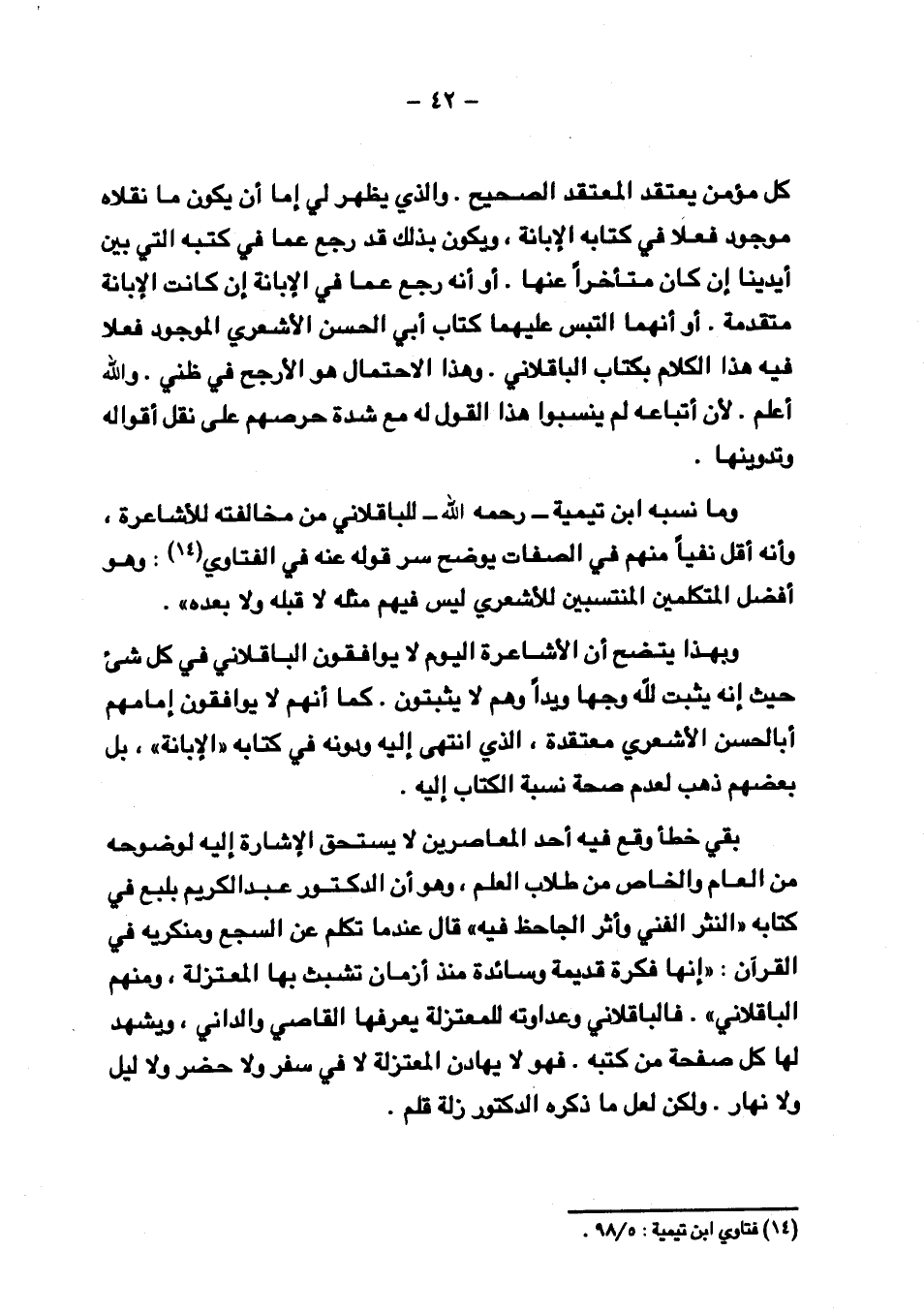 كل مؤمن يعتقد المعتقد الصحيح. والذي يظهر لي إما أن يكون ما نقلاه موجود فعلًا في كتابه الإبانة، ويكون بذلك قد رجع عما في كتبه التي بين أيدينا إن كان متأخرًا عنها. أو أنه رجع عما في الإبانة إن كانت الإبانة متقدمة. أو أنهما التبس عليهما كتاب أبي الحسن الأشعري الموجود فعلًا فيه هذا الكلام بكتاب الباقلاني. وهذا الاحتمال هو الأرجح في ظني. والله أعلم. لأن أتباعه لم ينسبوا هذا القول له مع شدة حرصهم على نقل أقواله وتدوينها.
