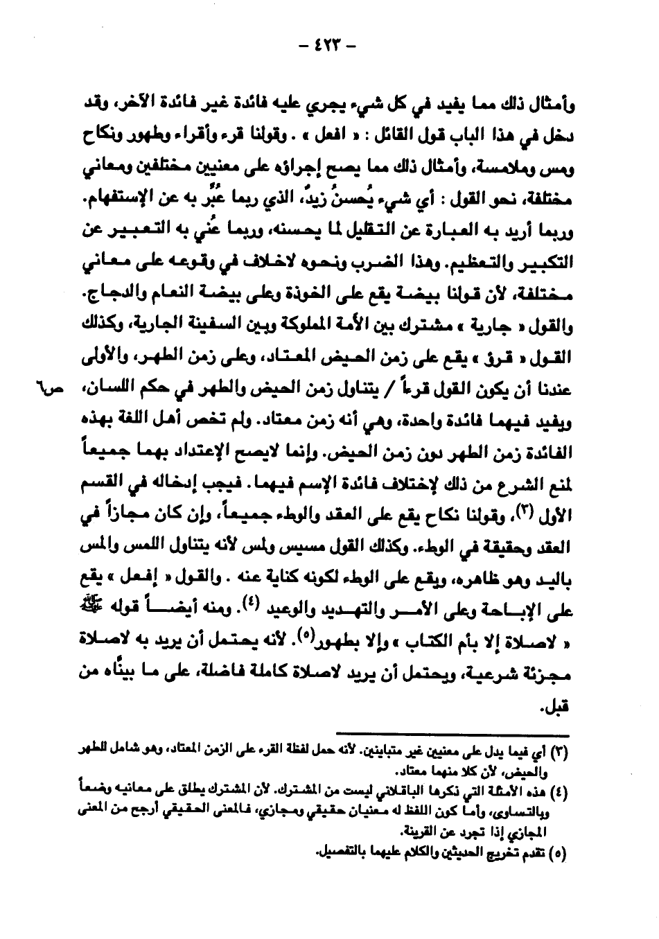 وأمثال ذلك مما يفيد في كل شيء يجري عليه فائدة غير فائدة الآخر، وقد دخل في هذا الباب قول القائل: "افعل". وقولنا قرء وأقراء وطهور ونكاح ومس وملامسة، وأمثال ذلك مما يصح إجراؤه على معنيين مختلفين ومعاني مختلفة، نحو القول: أي شيء يُحسن زيدٌ، الذي ربما عُبر به عن الاستفهام. وربما أريد به العبارة عن التقليل لما يحسنه، وربما عني به التعبير عن التكبير والتعظيم. وهذا الضرب ونحوه لا خلاف في وقوعه على معاني مختلفة، لأن قولنا بيضة يقع على الخوذة وعلى بيضة النعام والدجاج. والقول "جارية" مشترك بين الأمة المملوكة وبين السفينة الجارية، وكذلك القول "قرؤ" يقع على زمن الحيض المعتاد، وعلى زمن الطهر، والأولى عندنا أن يكون القول قرءًا/ ص ٦ يتناول زمن الحيض والطهر في حكم اللسان، ويفيد فيهما فائدة واحدة، وهي أنه زمن معتاد. ولم تخص أهل اللغة بهذه الفائدة زمن الظهر دون زمن الحيض. وإنما لا يصح الاعتداد بهما جميعًا لمنع الشرع من ذلك لاختلاف فائدة الاسم فيهما. فيجب إدخاله في القسم الأول، وقولنا نكاح يقع على العقد الوطء جميعًا، وإن كان مجازًا في العقد وحقيقة في الوطء. وكذلك القول مسيس ولمس لأنه يتناول اللمس والمس باليد وهو ظاهره، ويقع على الوطء لكونه كناية عنه. والقول "إفعل" يقع على الإباحة وعلى الأمر والتهديد والوعيد. ومنه أيضًا قوله صلى الله عليه وسلم "لا صلاة إلا بأم الكتاب" وإلا بطهور. لأنه يحتمل أن يريد به لا صلاة مجزئة شرعية، ويحتمل أن يريد لا صلاة كاملة فاضلة، على ما بيناه من قبل.