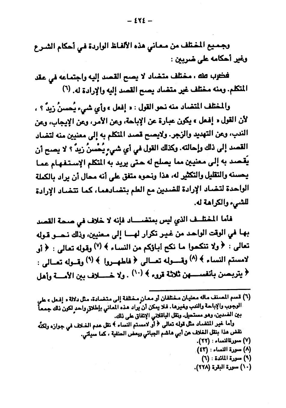 فأما المختلف الذي ليس بمتضاد فإنه لا خلاف في صحة القصد بها في الوقت الواحد من غير تكرار لها إلى معنيين، وذلك نحو قوله تعالى: {ولا تَنكِحُوا مَا نَكَحَ آبَاؤُكُم مِّنَ النِّسَاءِ} وقوله تعالى: {أَوْ لامَسْتُمُ النِّسَاءَ} وقوله تعالى {فَاطَّهَّرُوا} وقوله تعالى: {يَتَرَبَّصْنَ بِأَنفُسِهِنَّ ثَلاثَةَ قُرُوءٍ}. ولا خلف بين الأمة وأهل