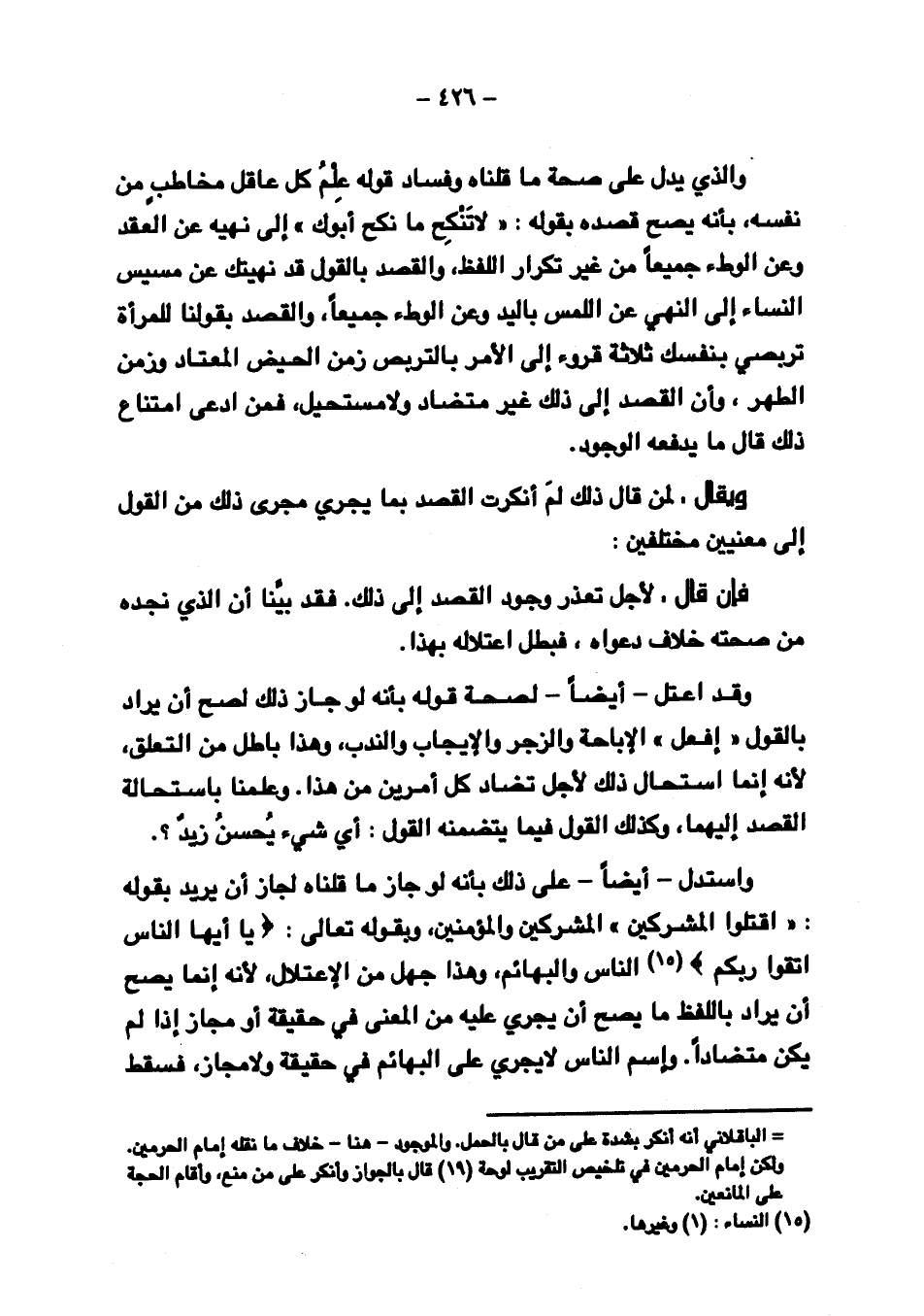 واستدل - أيضًا - على ذلك بأنه لو جاز ما قلناه لجاز أن يريد بقوله: "اقتلوا المشركين" المشركين والمؤمنين، وبقوله تعالى: {يَا أَيُّهَا النَّاسُ اتَّقُوا رَبَّكُمْ} الناس والبهائم، وهذا جهل من الاعتلال، لأنه إنما يصح أن يراد باللفظ ما يصح أن يجري عليه من المعنى في حقيقة أو مجاز إذا لم يكن متضادًا. واسم الناس لا يجري على البهائم في حقيقة ولا مجاز، فسقط