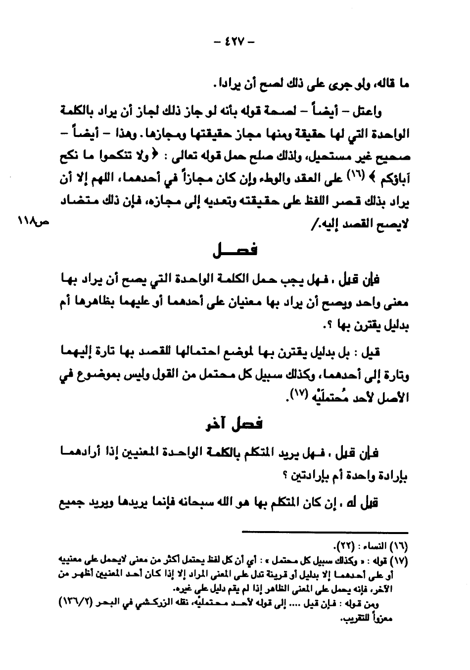 واعتل - أيضًا - لصحة قوله بأنه لو جاز ذلك لجاز أن يراد بالكلمة الواحدة التي لها حقيقة ومنه مجاز حقيقتها ومجازها. وهذا - أيضًا - صحيح غير مستحيل، ولذلك صلح حمل قوله تعالى: {ولا تَنكِحُوا مَا نَكَحَ آبَاؤُكُم} على العقد والوطء وإن كان مجازًا في أحدهما، اللهم إلا أن يراد بذلك قصر اللفظ على حقيقته وتعديه إلى مجازه، فإن ذلك متضاد لا يصح القصد إليه./ ص ١١٨