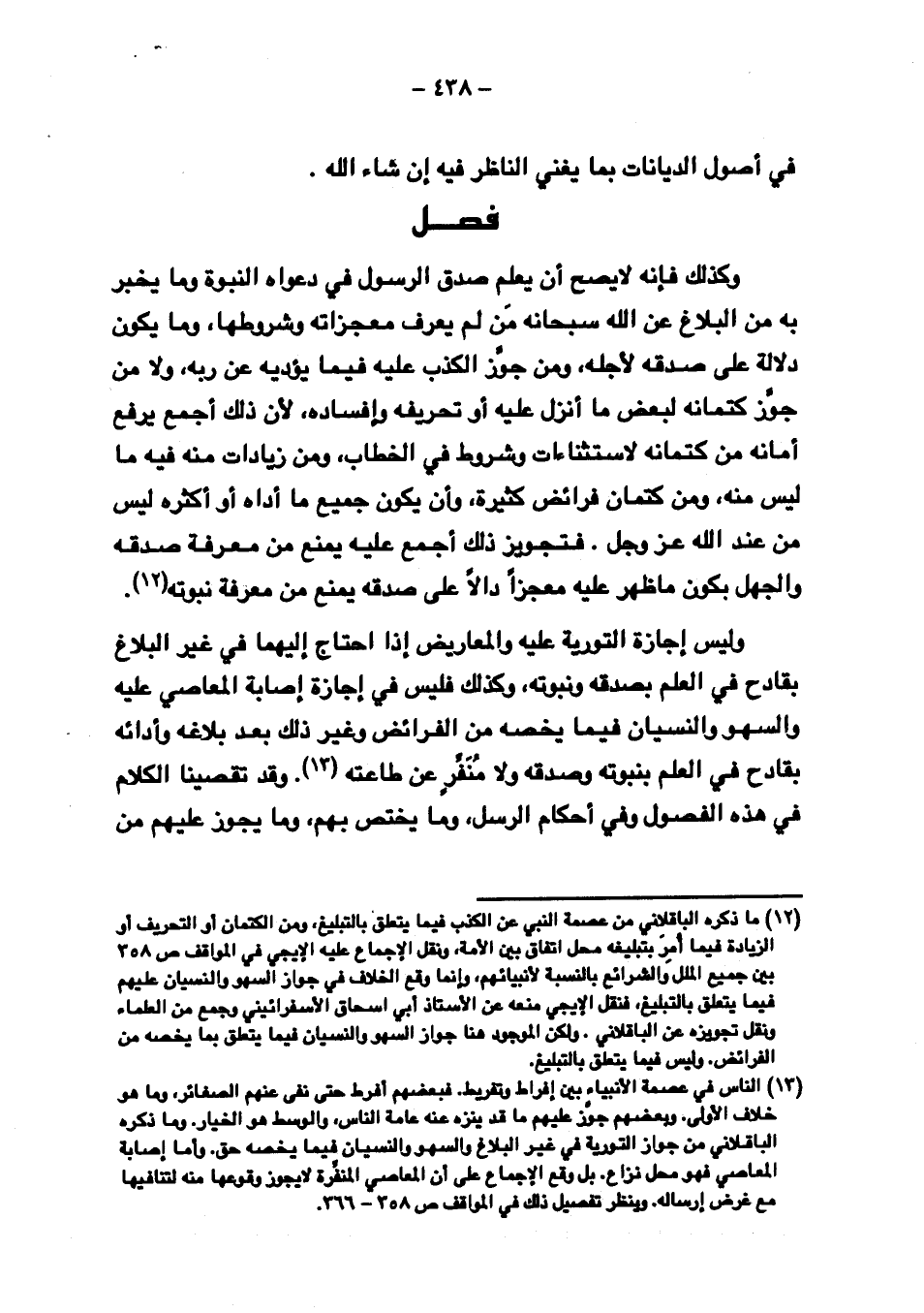 وليس إجازة التورية عليه والمعاريض إذا احتاج إليهما في غير البلاغ بقادح في العلم بصدقه ونبوته، وكذلك فليس في إجازة إصابة المعاصي عليه والسهو والنسيان فيما يخصه من الفرائض وغير ذلك بعد بلاغه وأدائه بقادح في العلم بنبوته وصدقه ولا منفر عن طاعته. وقد تقصينا الكلام في هذه الفصول وفي أحكام الرسل، وما يختص بهم، وما يجوز عليهم من