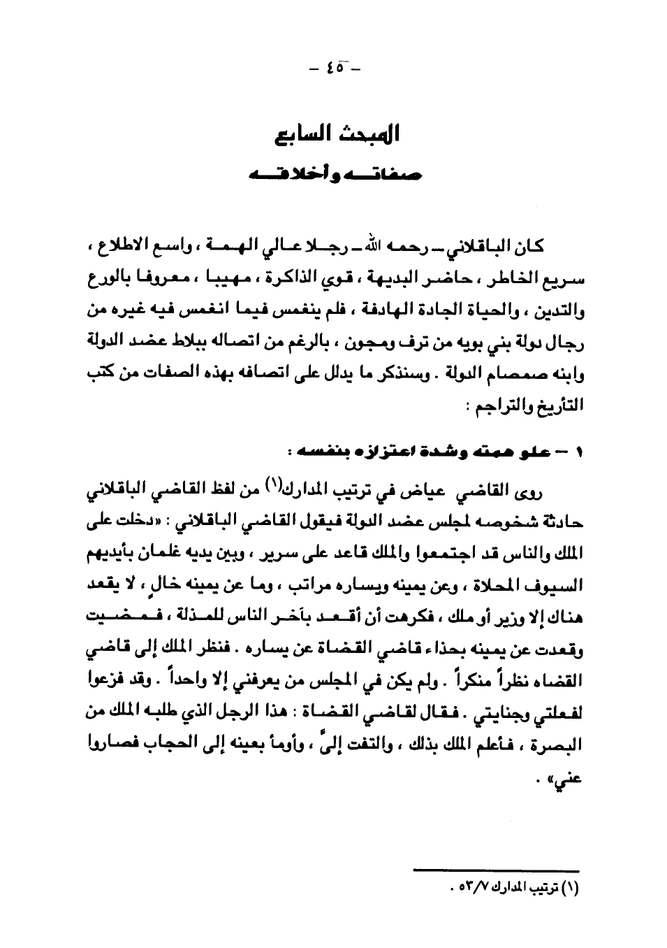 روى القاضي عياض في ترتيب المدارك من لفظ القاضي الباقلاني حادثة شخوصه لمجلس عضد الدولة فيقول القاضي الباقلاني: "دخلت على الملك والناس قد اجتمعوا والملك قاعد على سرير، وبين غلمان بأيديهم السيوف المحلاة، وعن يمينه ويساره مراتب، وما عن يمينه خالٍ، لا يقعد هناك إلا وزير أو ملك، فكرهت أن أقعد بآخر الناس للمذلة، فمضيت وقعدت عن يمينه بحذاء قاضي القضاة عن يساره. فنظر الملك إلى قاضي القضاة نظرًا منكرًا. ولم يكن في المجلس من يعرفني إلا واحدًا. وقد فزعوا لفعلتي وجنايتي. فقال لقاضي القضاة: هذا الرجل الذي طلبه الملك من البصرة، فأعلم الملك بذلك، والتفت إلى، وأومأ بعينه إلى الحجاب فصاروا عني".