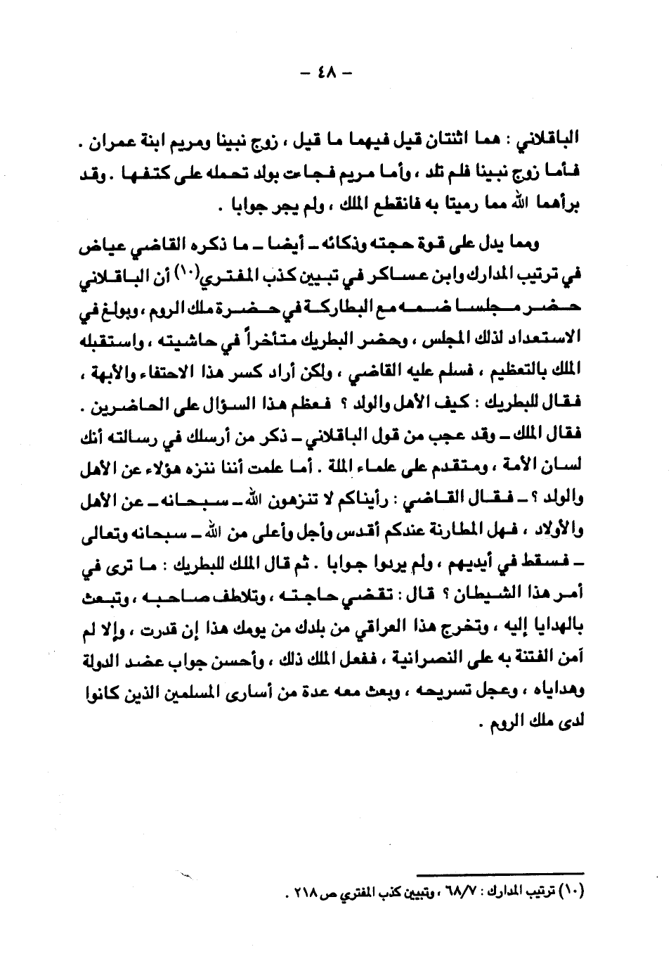 ومما يدل على قولة حجته وذكائه - أيضًا - ما ذكره القاضي عياض في ترتيب المدارك وابن عساكر في تبيين كذب المفتري أن الباقلاني حضر مجلسًا ضمه مع البطاركة في حضرة ملك الروم، وبولغ في الاستعداد لذلك المجلس، وحضر البطريك متأخرًا في حاشيته، واستقبله الملك بالتعظيم، فسلم عليه القاضي، ولكن أراد كسر هذا الاحتفاء والأبهة، فقال للبطريك: كيف الأهل والولد؟ فعظم هذا السؤال على الحاضرين. فقال الملك - وقد عجب من قول الباقلاني - ذكر من أرسلك في رسالته أنك لسان الأمة، ومتقدم على علماء الملة. أما علمت أننا ننزه هؤلاء عن الأهل والولد؟ - فقال القاضي: رأيناكم لا تنزهون الله - سبحانه - عن الأهل والأولاد، فهل المطارنة عندكم أقدس وأجل وأعلى من الله - سبحانه وتعالى - فسقط في أيديهم، ولم يردوا جوابًا. ثم قال الملك للبطريك: ما ترى في أمر هذا الشيطان؟ قال: تقضي حاجتهن وتلاطف صاحبه، وتبعث بالهدايا إليه، وتخرج هذا العراقي من بلدك من يومك هذا إن قدرت، وإلا لم آمن الفتنة به على النصرانية، ففعل الملك ذلك، وأحسن جواب عضد الدولة وهداياه، وعجل تسريحه، وبعث معه عدة من أسارى المسلمين الذين كانوا لدى ملك الروم.